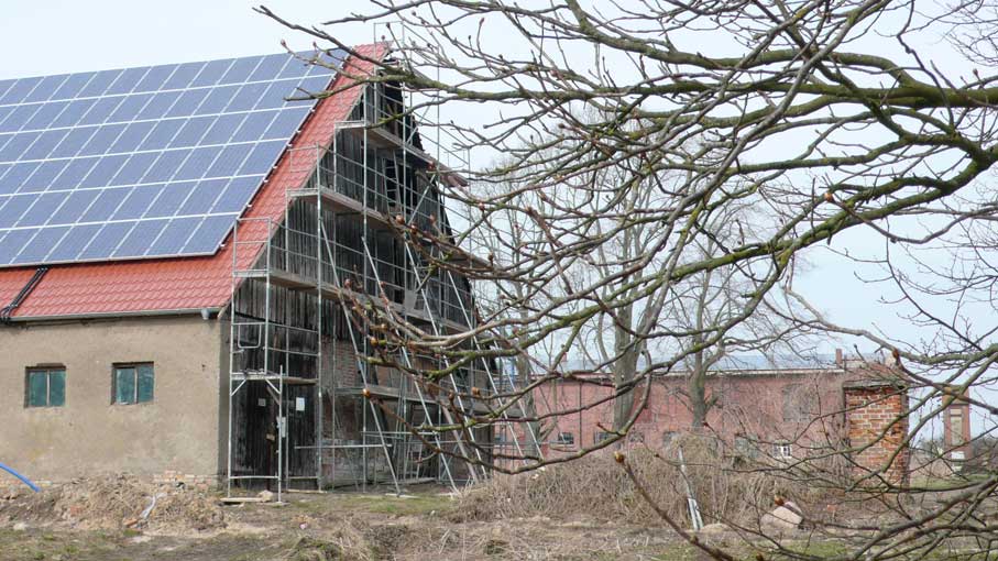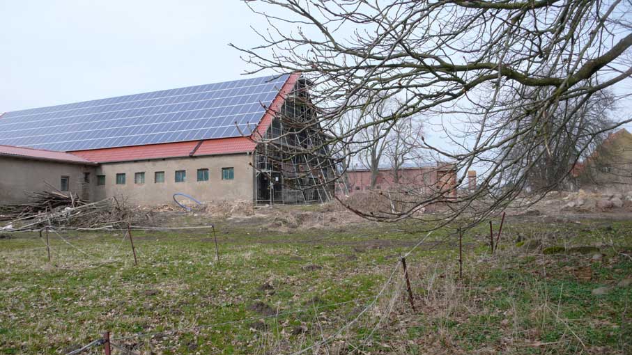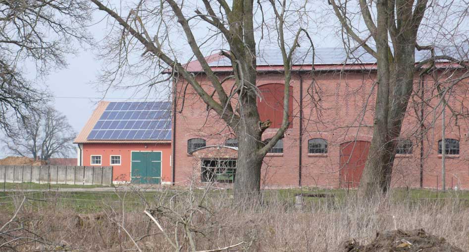 Das silbrige Blau der PHotvoltaik-Dächer passt abseits zum Grün der Trebel-Wiesen