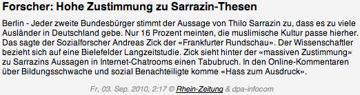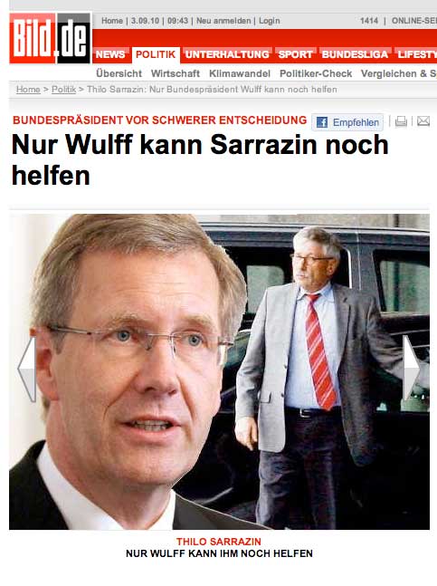 Um 16:35 unterbricht die Sprecherin das laufende Radionprogramm, d.i. Musik eines Hollywoodfilms (NDR Kultur), um mitzuteilen, dass T.Sarrazin zur Entlassung von seinem Amt als ein Bundesbankvorsitzender vorgeschlagen wird. In der selben Minute folgen die anderen Nachrichten-Medien mit Eilmeldungen.