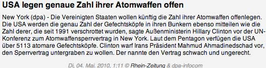 Die USA hätten einen "Schatten der Angst" über die Welt gelegt, polterte Ahmadinedschad. Der Besitz von Atomwaffen sei kein Anlass zu Stolz, "er ist widerlich und beschämend", sagte er. "Und noch beschämender ist es, die Furcht vor diesen Waffen zu benutzen. Das ist mit keinem anderen Verbrechen in der Geschichte zu vergleichen."