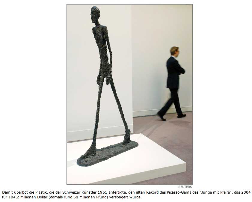 Auf die Meldung von 104,3 Mill Dollar für Giacomettis Schreitenden Mann. Und die Frage, was das alles bedeutet. Dazu wird man etwas Abstand nehmen müssen. Wie das entstand, was wir Kunst nannten. Wofür, und sich die Orte vorstellen , sowie die Rituale, oder Geheimnissse und Tabus in die sie eingebunden war.