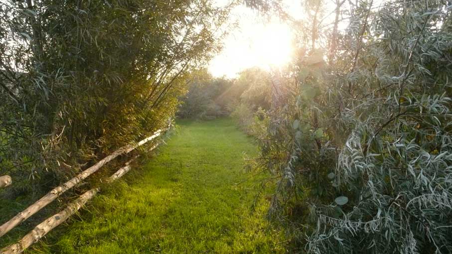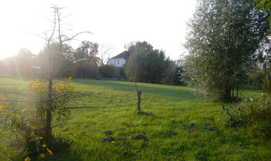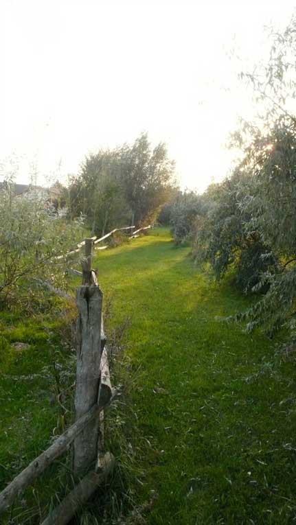 Der wieder enstandene Weg vom Hof auf die Felder wird zur Verbindung werden von den geplanten Anlagen auf den früheren Koppeln über den Hof zur Kirche.