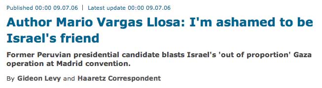 "Internationally acclaimed author and former Peruvian presidential candidate, Mario Vargas Llosa, over the weekend slammed Israel's "out of proportion" operation in the Gaza Strip, saying he was ashamed of being Israel's friend.