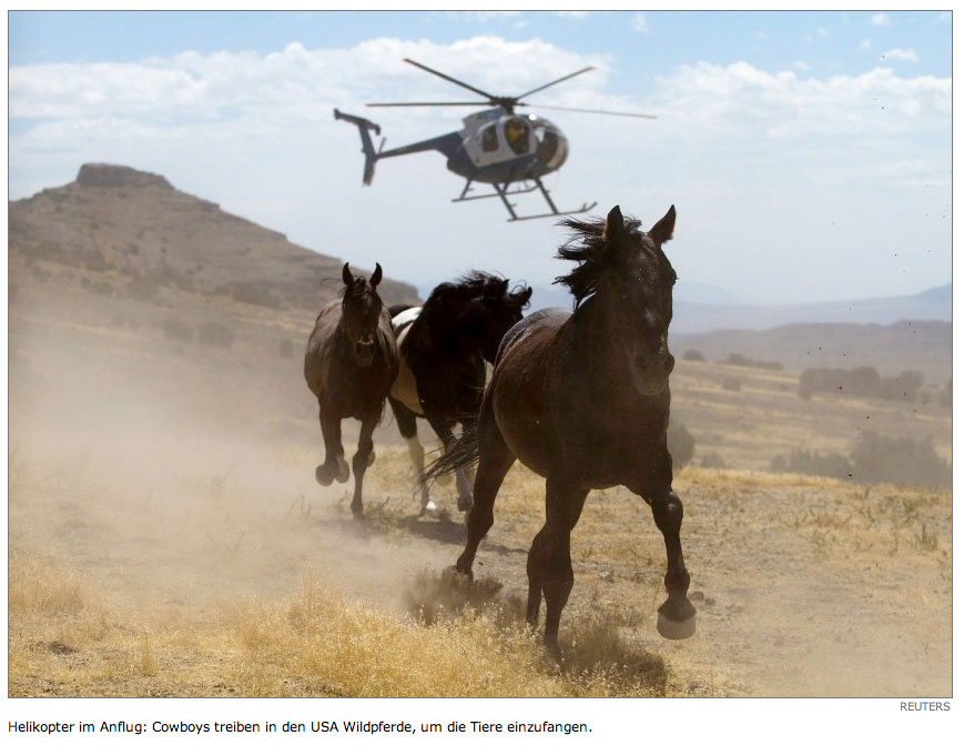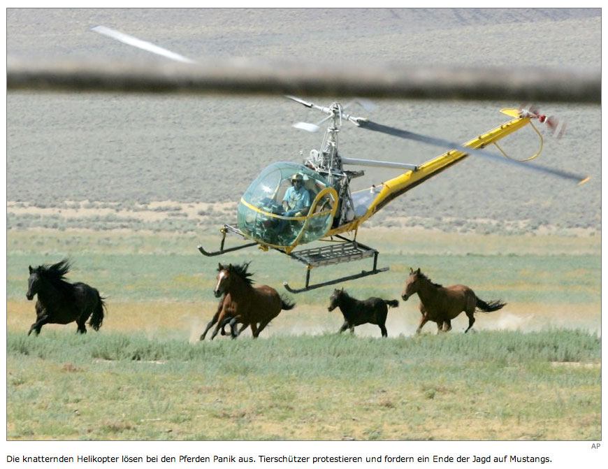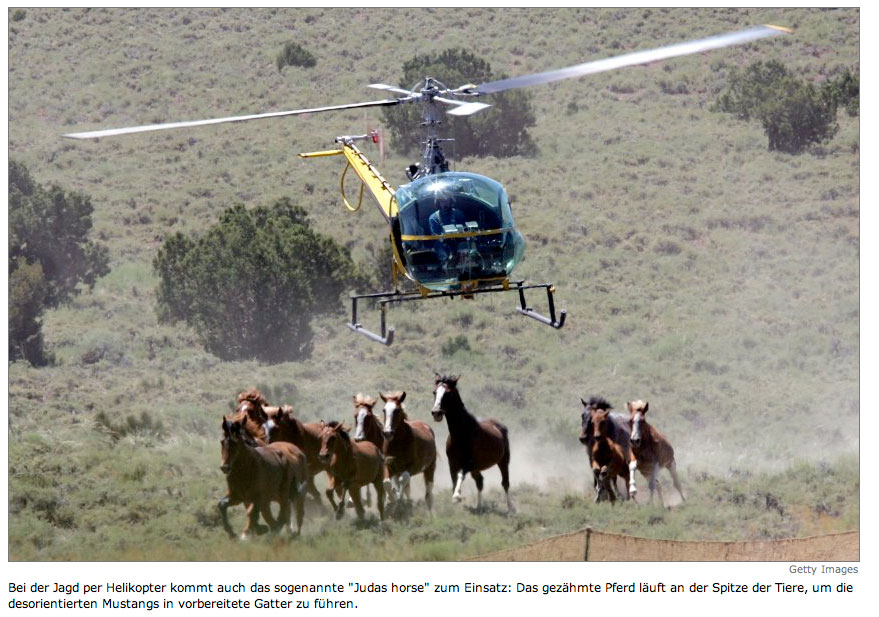 Und was geschieht dann mit den Pferden? Das Interesse an ihnen ist offenbar nicht sonderlich gro§, zu teuer ist die Haltung der Tiere. Einem Bericht der "New York Times" zufolge landen viele von ihnen auf Ranches in Kansas und Oklahoma. Die Jagd und das spŠtere Gnadenbrot fŸr die Pferde geht auf Kosten der Steuerzahler: Im vergangenen Jahr hat das Mustangprogramm der "New York Times" zufolge 40,6 Millionen Dollar verschlungen.