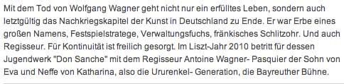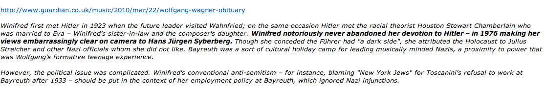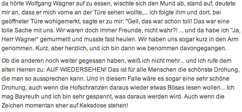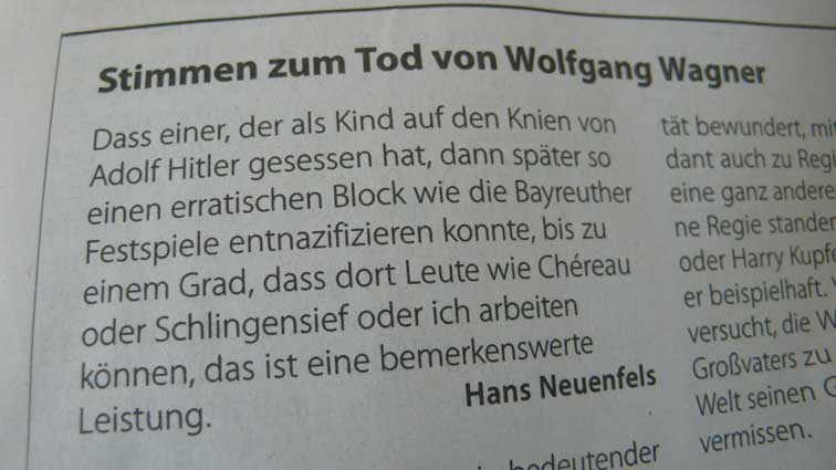 Warum der Hersteller eines Hitler-Films nicht in Bayreuth auftreten durfte. Und solche Schlingel schon, ohne Erforschung der Tat und ohne Bilder, die was lösen. Aber gerade dieser andere wärs gewesen, der noch etwas anderes tun konnte, als solchen einen Film des Wissens zu Bayreuth. Und hat er nicht gerade Dadurch B. entsühnt, auf eben andere Weise und eben nicht in, aber für. Der Trauer Arbeit, wie das damals gerne und ganz gut hiess, wärs aber gewesen am Orte selbst, wie im Lande das zu tun, was nun überall nur nicht hier geschah und geschieht. So musste denn, nach leibhaftem Einsatz von Michel Guy, dem ehemaligen Kulturminister aus Paris, bei Wolgang Wagner, dem genialen Intendanten in B. nach gerade Boulez /Chereau, dieser selbst einspringen zuhaus die Bühne liefern, und es entstand Die Nacht in Paris 6 Stunden auf der Pariser Bühne von Chereau die Abschied von Bayreuth.Und deren Regisseur hörte zum letzten Mal, in Bayreuth aus dem Zuschauerraum verbannt, vor geschlossenen Türen live im Transistorradio den Parsifal in B. Auch das war Wolfgang Wagner, der sich zuvor weigerte den Parsifal als Film für Bayreuth anzusehen: ich werde doch nicht durch mein Erscheinen dafür werben. Was so geschah wie sonst nichts für Bayreuth. Die Nacht aber enthielt eine Befreiung, die man Bayreuth gewünscht hätte - nun als Film. Am anderen Ort und Trauer jede Menge. Dort. Das gibt Freiheit des Sprechens und ratens von Hais zu Haus.