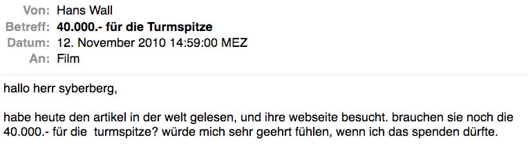 Die grosszügige Spende von 40 000 Euro garantiert nun jedem weiteren Teilnehmer, dass der Turm gebaut wird, und jede weitere Spende dort eingebrannt werden wird.