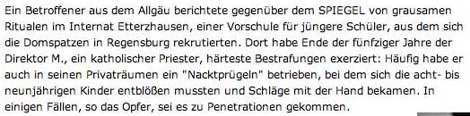 The director and composer Franz Wittenbrink, who lived until 1967 in the Regensburg cathedral choir boarding, speaks of an "elaborate system of sadistic punishments associated with sexual pleasure" that existed there.Director of Boarding Z. had "picked at night in a dormitory two or three of us guys that he took into his apartment."Where there was red wine and the priest was masturbating with the minors."Everyone knew it," says Wittenbrink, a nephew of the former Bavarian Prime Minister Alfons Goppel.