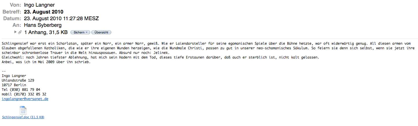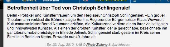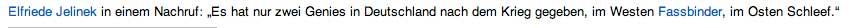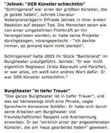 JELINEK ZU SCHLINGENSIEF: MÜSSEN WIR HALT BLUTKUCHEN ESSEN (SZ) ... Auch Elfriede Jelinek hat dem Künstlerfreund, der 2003 am Burgtheater ihr Irak-Stück ...