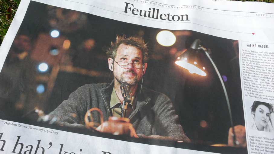 Als wir uns 2006 in Wolfsburg und dann noch mal in Berlin, -der Akademie anlässlich Schleef-, auf den Podien trafen, war er ein herzlicher und lieber Alliierter bis zum letzten Dankes-Gruss im Hotel vor den Zimmern, jeder in seine Tür auf dem selben Flur. Dank, dachte ich mir, wofür. Und irgendwie tat er mir unendlich leid. Aus den Film- Aufnahmen von G.A. in Wolfsburg nahm ich dies Standbild.