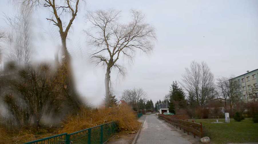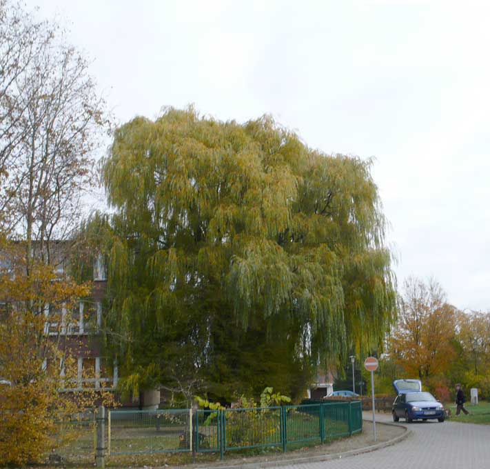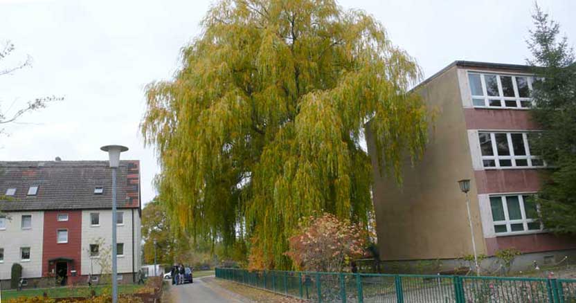 Noch verdecken zwei mächtige Weiden den Schulkomplex links