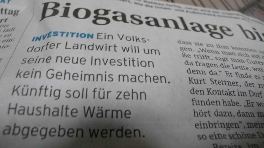 Im Nachbar-Ort "der Bauer" R.Tietböhl im Nordkurier mit seiner neuen Biogas-Anlage für eine Million für seine Michkuhanlage und 10 Haushalte im Ort. Das ist aufwendig, verbraucht aber die Gülle der Kühe, die nicht rauskommen, und verbraucht "nur" 40 Hektar" Mais zusätztlich von seinen Feldern., erspart 3 500 Liter Öl für seine Anlagen(soviel wir wir in München für einen Haushalt). Ohne Förderungsgelder gehts sicher nicht, den Anteil erfahren wir nicht. Mit Kühen heute allein durchzukommen, bei 660 Hektar und 10 Mitarbeiter ist schwer, auch für den Präsident der mecklenburg-vorpommernschen Bauern. Und das sind oft keine Bauern mehr, sondern Konzerne, die ihr Geld dort parken.