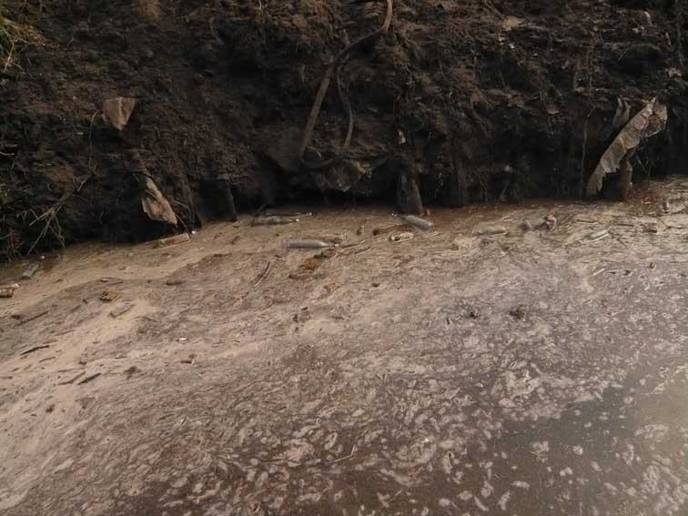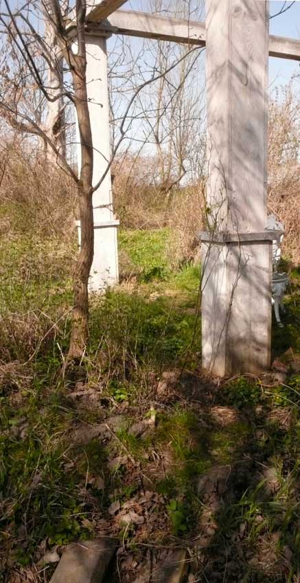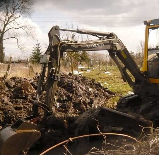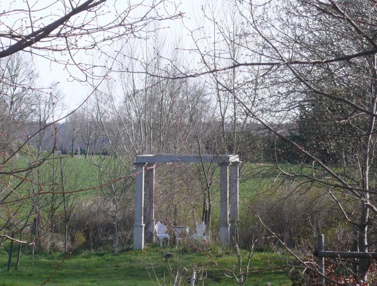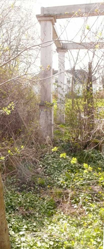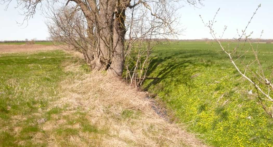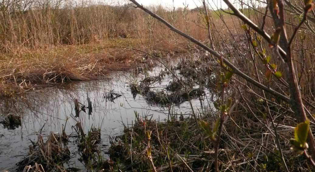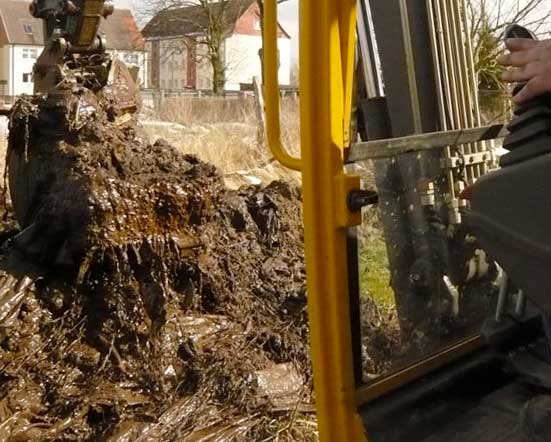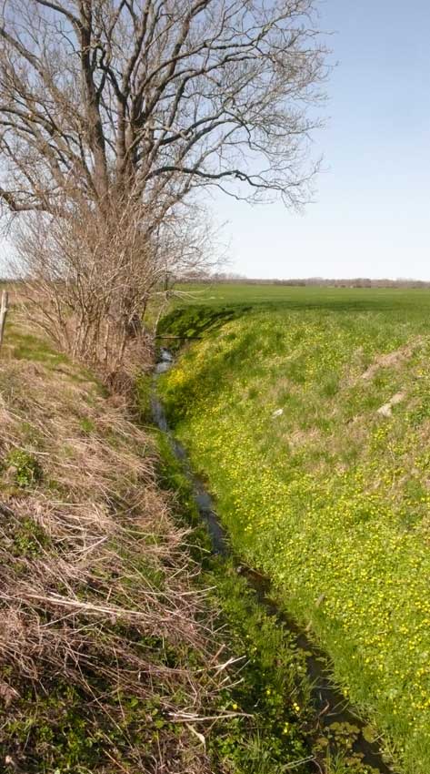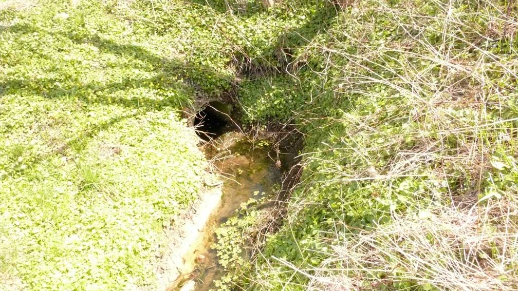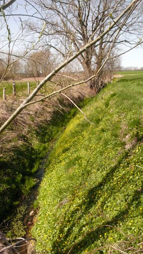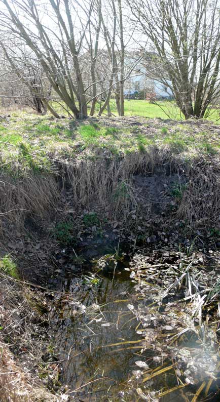 Der Graben der Eiszeit, wie er hinter dem Park und Garten des Gutes nun in Rohren ohne entwässernden Zufluss wieder rauskommt, wo er sein darf was er ist.