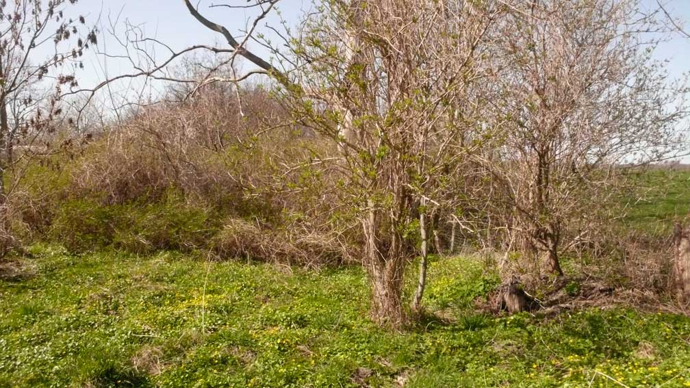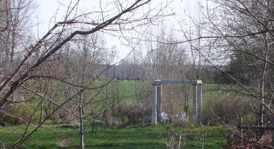 Gerade im Frühjahr, noch ohne Blätter, schauen wir ungehindert über das Land bis an den Wolde-Forst. Dazwischen liegen, hinter dem Sportplatz jetzt, die Felder des Vaters und des Kindes. Wir schauen auf das Land der Filme vom eigenen Tun, vom Säen und Ernten und wie sie am 12. Juni, Pfingsten, am Speicher in Demmin zur Geschichte des Landes vorgeführt werden.