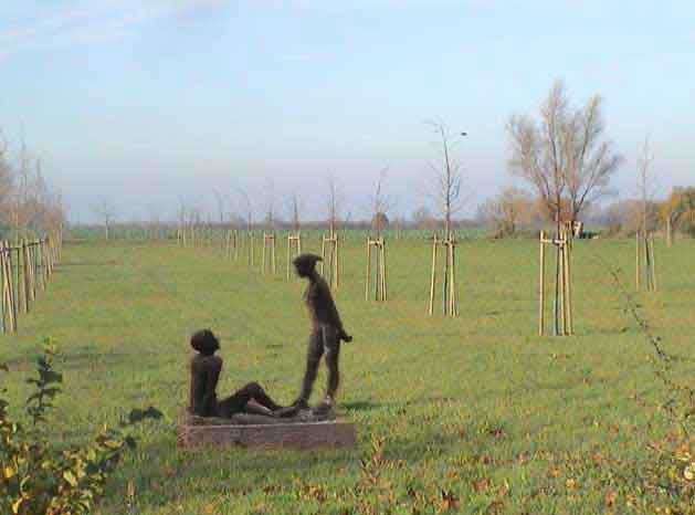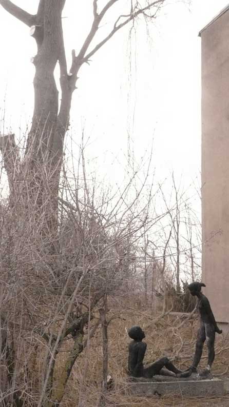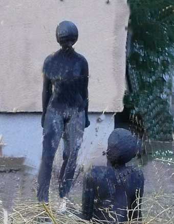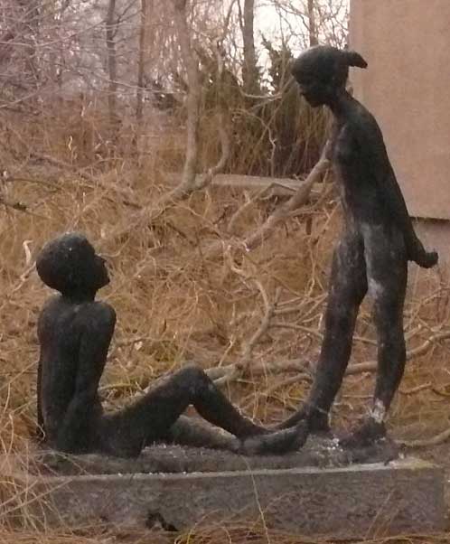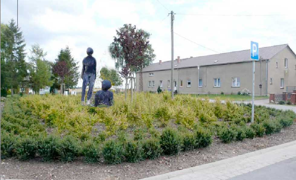 Der Bürgermeister, der für Nossendorf zuständig ist, hat Kunstinteresse bewiesen, indem er diese beiden Figuren vor der Schule, obwohl die Schule verlassen ist und zum Abriss vorgeschlagen und die Weiden, die sie beschützten auf sein Betreiben gefällt wurden, vor dem Verkauf bewahrte, ohne den Gemeinderat zu befragen, selbst nicht für ganz schönes Geld in die leere Kassen, so dass wir vorschlagen, sie an geeigneter Stelle, statt hier missachtet im toten Winkel, aufzustellen, damit sie einen Sinn wieder erhalten, wie vorher vor der Schule, für alle, die vorbeikommen,