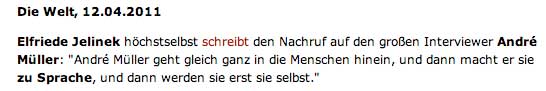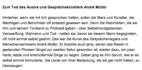 Nun hats ihn also erwischt, den soviel Jüngeren. Der in jedem seiner Interviews nach dem Tode fragte als Zeichen seiner Unruhe vor dem, was ihn umtrieb. Eine schlimme Figur im Betrieb der Medien. Absprachen hielt er nicht ein. Ging an die Interviewten ran, als Figuren seines Spiels mit ihnen. Setzte die Teile des Tones, abgeschrieben nach Belieben, in seinem Interesse zusammen, Fragen weg, in andere Zusammenhänge, verwertete das Gesagte nach seinem System, das das der Zeit war. Es kam heraus, was die Befragten nie gesagt, auf Fragen, die nie gestellt waren, als Gejagte der Meinungs-Meute im Teppich dessen, was alle hören wollten, zum Gelächter der Konkurenz. Die Frage blieb, warum wir alle mitgemacht als Bedürftige des Betriebs ausgebeutet, voraussehbar, vor einem, von dem jeder wusste, dass er eine Ratte war, die alles in dunklen Gängen seines dunklen Ichs verspeiste und liegen liess. Nur einen kriegte er nicht -Ernst Jünger, der das finstere Spiel kannte- so, dass er dann von diesem in einem nie geführten Gespräch vorgeführt wurde, eine Totalität der Fälschung pur. Und wieder grinste alles rundum, aber mit offenen Karten.