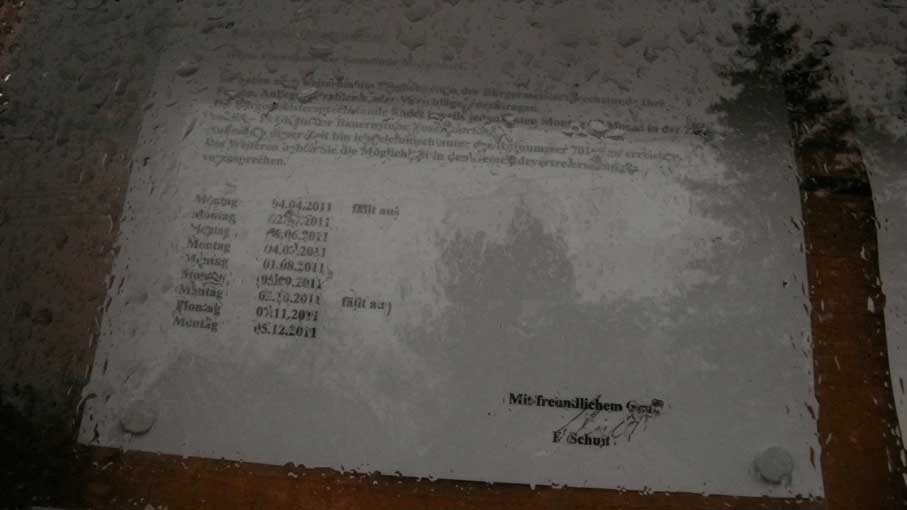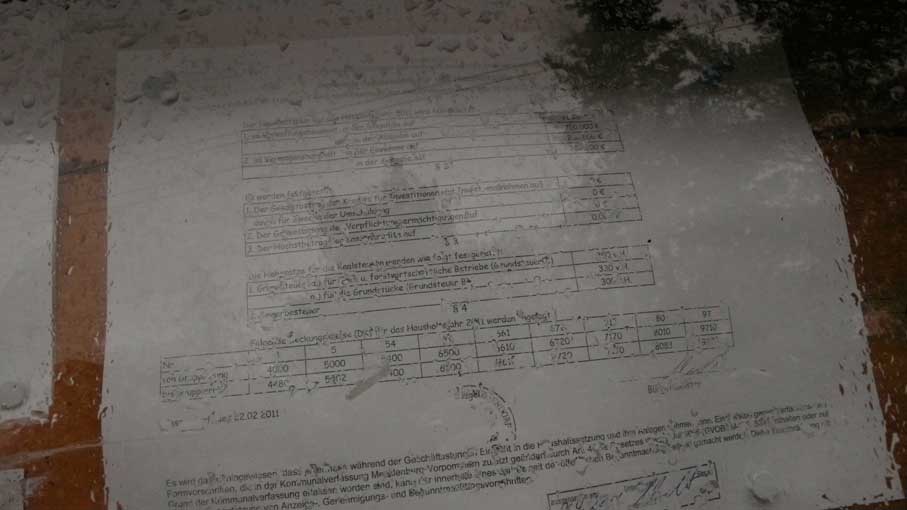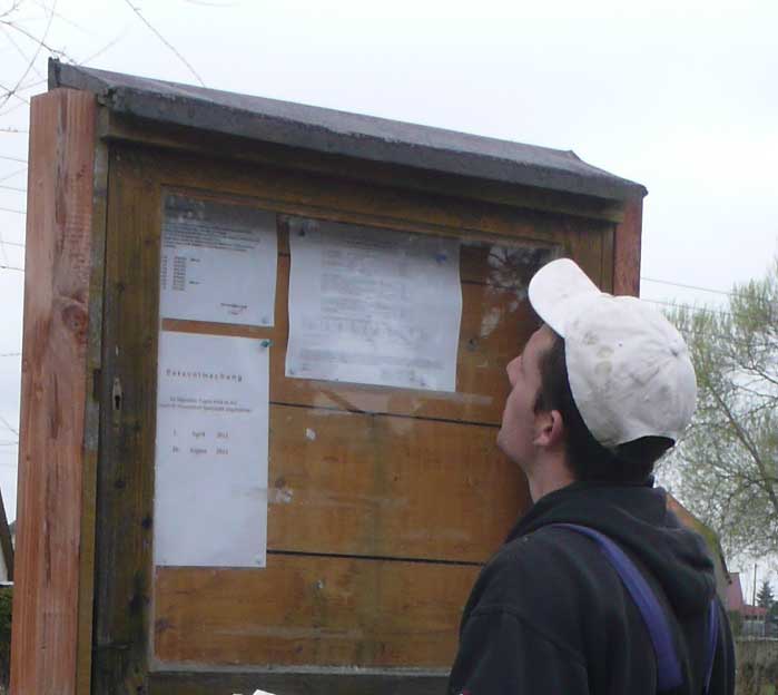 Wie sagte Friedrich der Grosse von Preussen als er in der Kutsche an ihn verspottende Bilder vorbeifuhr: niedriger hängen! damit es alle und besser sehen können. Denn er wollte den Spott nicht alleine sehen. Ob wohl die hier Regierenden und ihre Flächenbesitzer heute davon gehört haben, wenn sie ihre Dinge so anbringen, dass man den Anforderungen der öffentlichen Bekanntgabe entspricht, aber ihre unangenehmen Dinge nicht lesen kann. Wie mache ich etwas bekannt, ohne es bekannt zu machn.