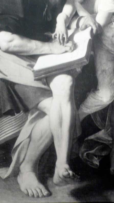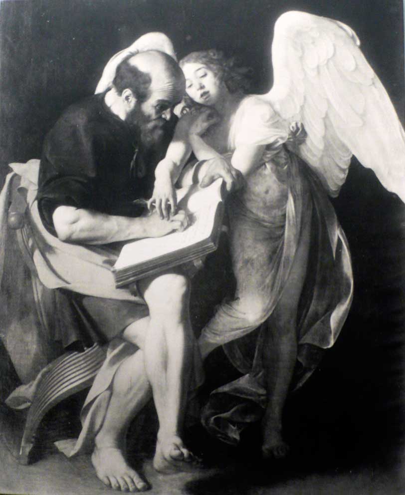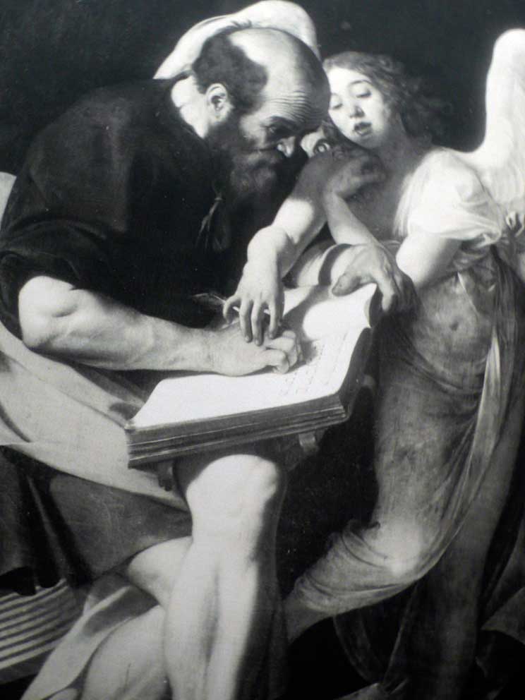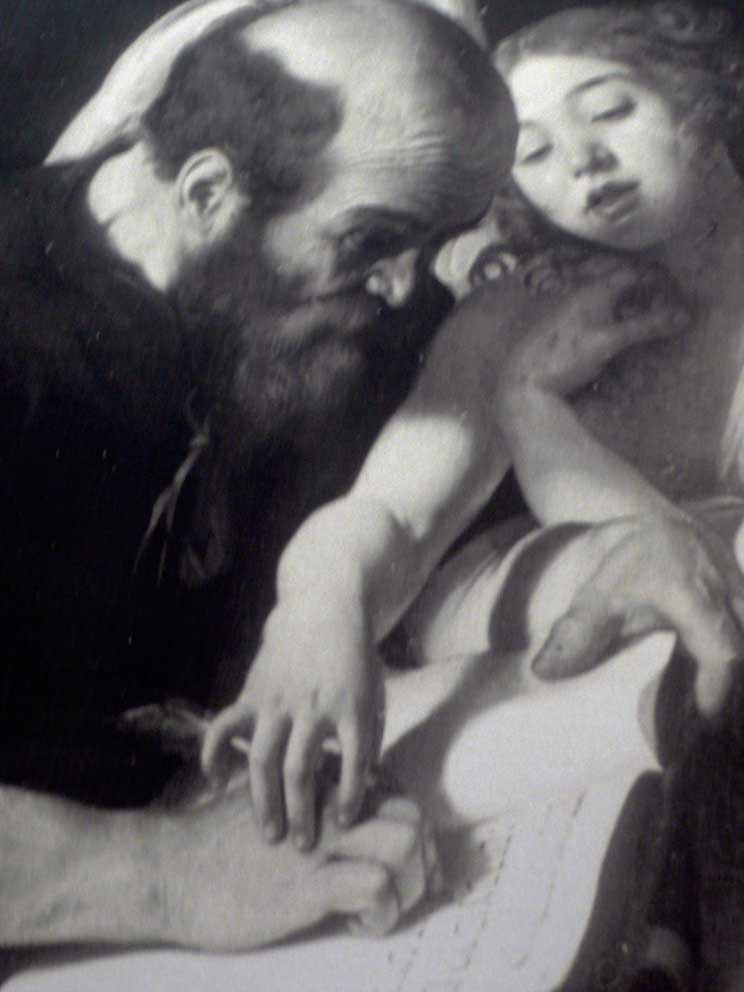und wurden Meister der Erfindungen und Nachahmung all dessen, was wir aus unseren Leben kannten, das nun dem Gotte ihrer Anbetung in seiner Geschichte darzustellen war. Hier bei Caravaggio indem das göttliche Kind dem Heiligen des Buches die Hand führt, wenn er die Geschichte des Gottes schreibt.