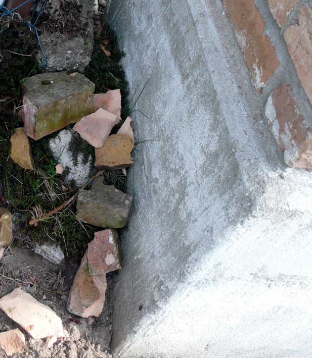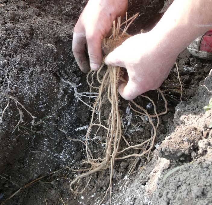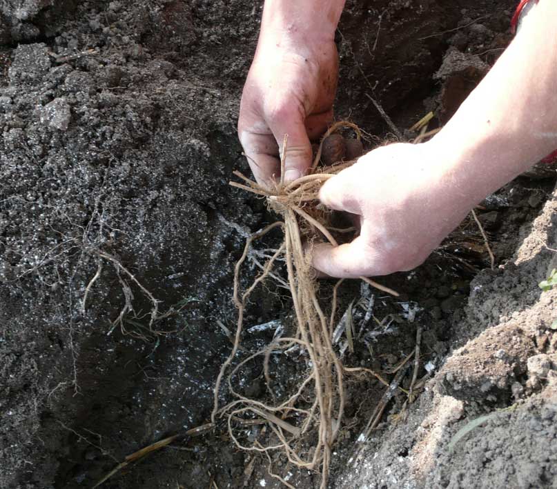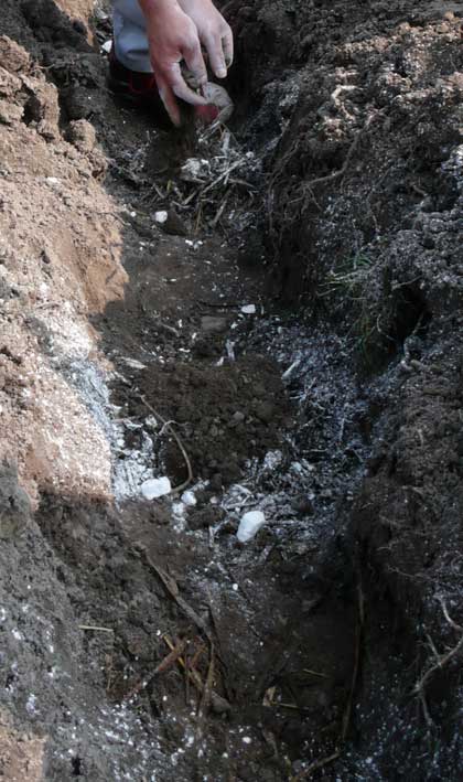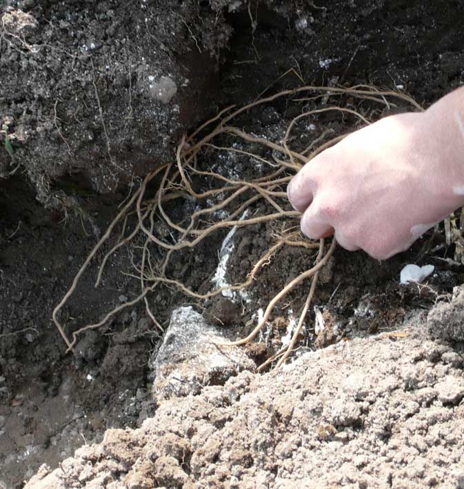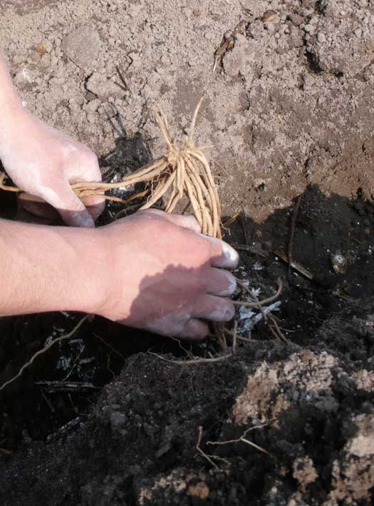 Dann der Kalk und darauf etwas Erde, dass ein kleiner Haufen entsteht und darüber die gespreitzten Wurzeln mit dem Triebauge nach oben.