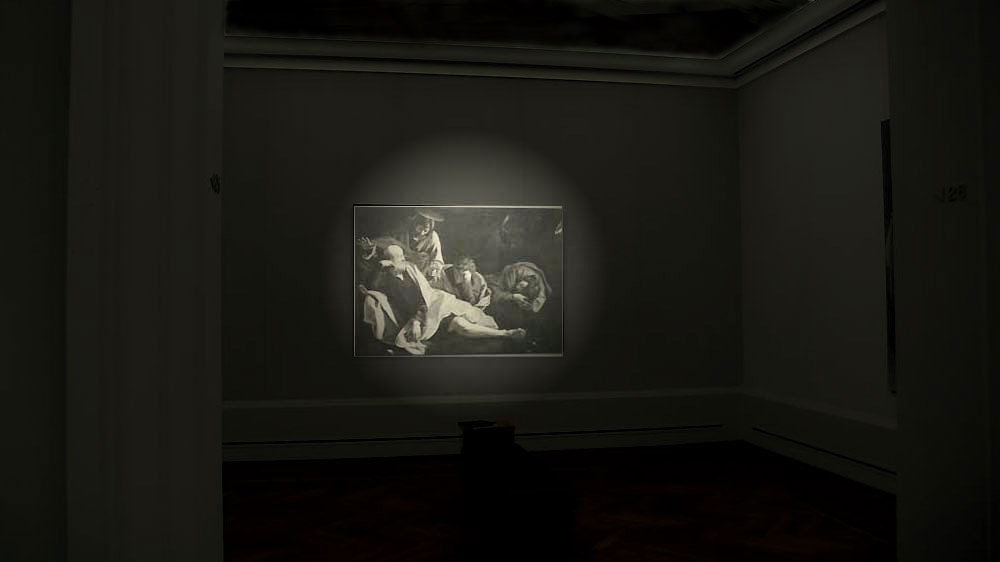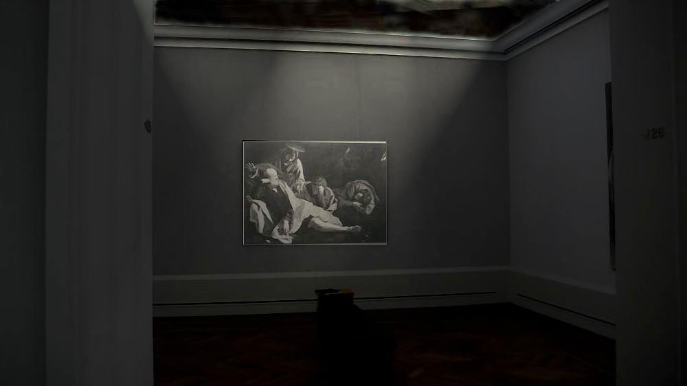 noch mal Varianten die verlorenen Originale im Raume zu installieren, in ihrer originalen Grösse des Schwarz-Weiss aufzunehmen und extra im Licht von allem sonst abgesetzter Dunkelheit. Und wenn nicht dort so dann eben hier.