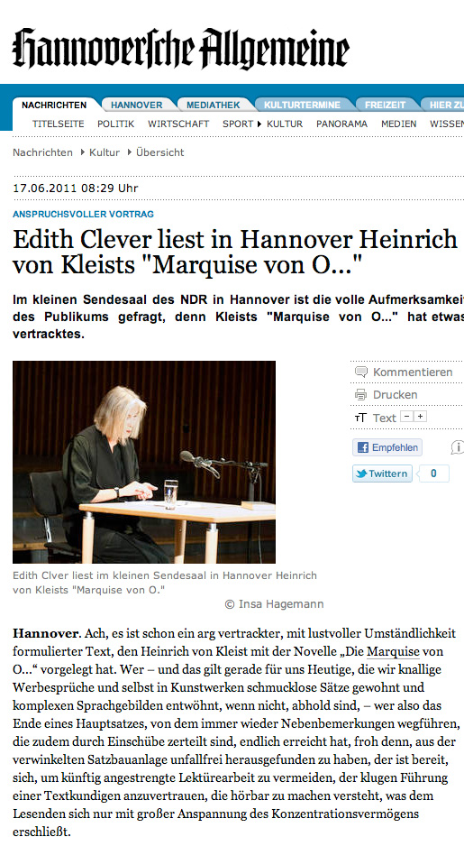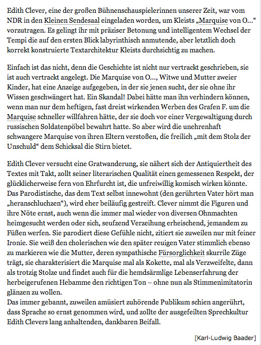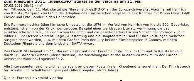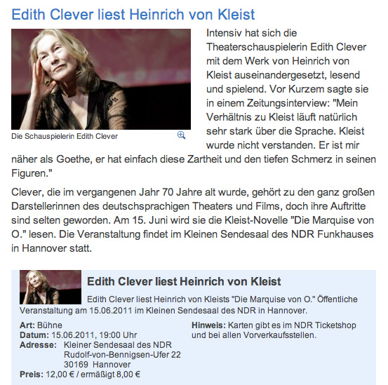 ohne Preis je und nirgendwo aufgeführt oder erwähnt im Kleistjahr 2011 der vielen Events, auch diese Marquise nicht. Aber hier ist sie da und gelaufen. Wie Kleist am Rande seiner Welt.