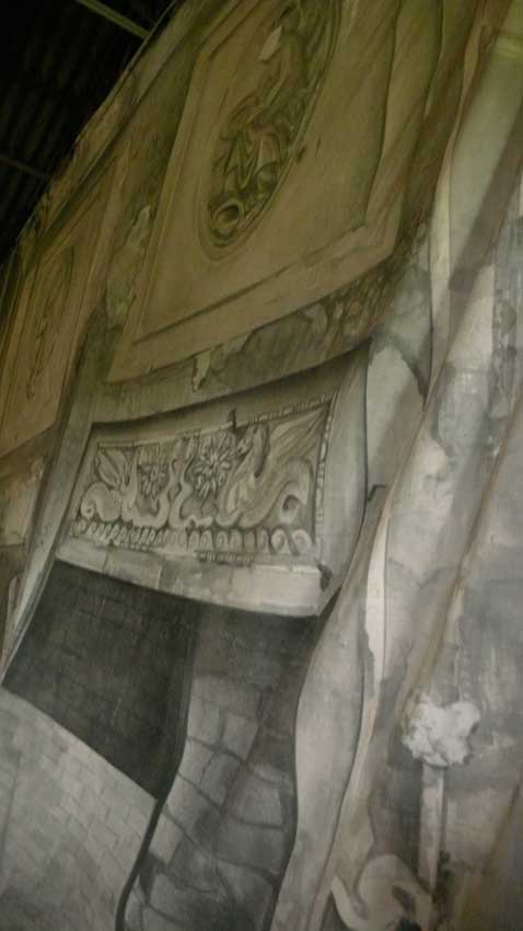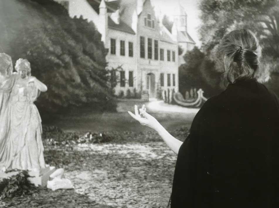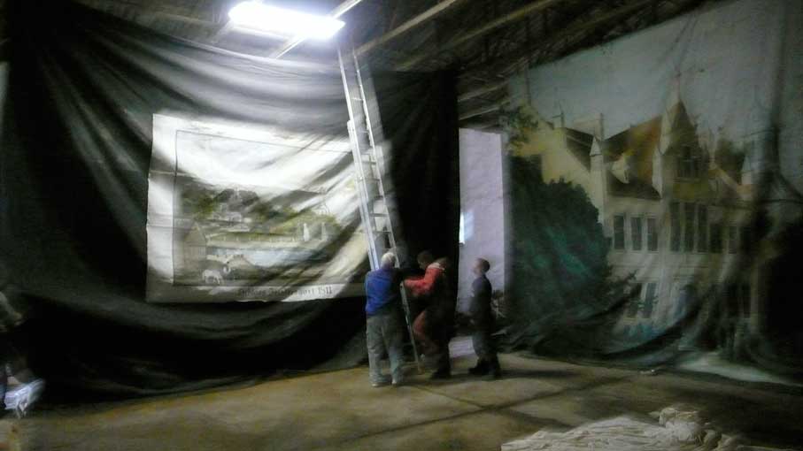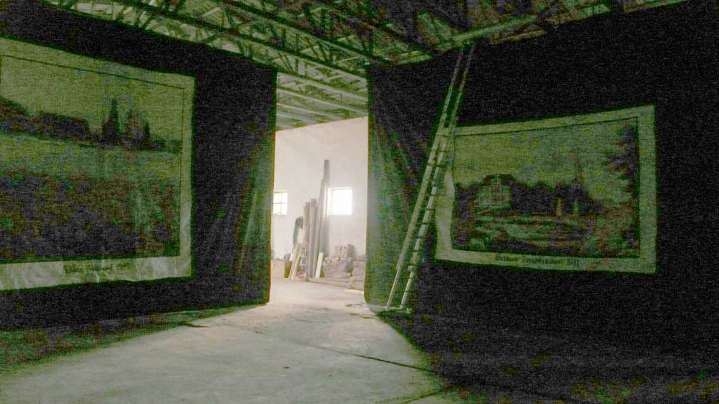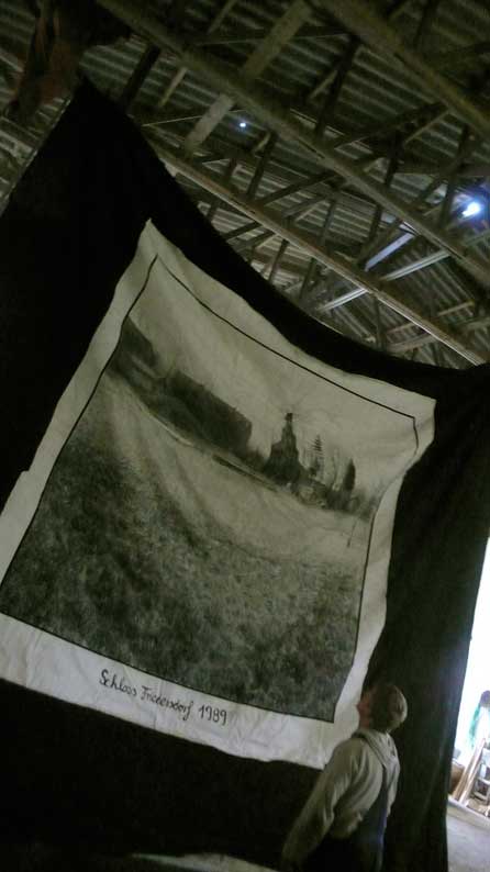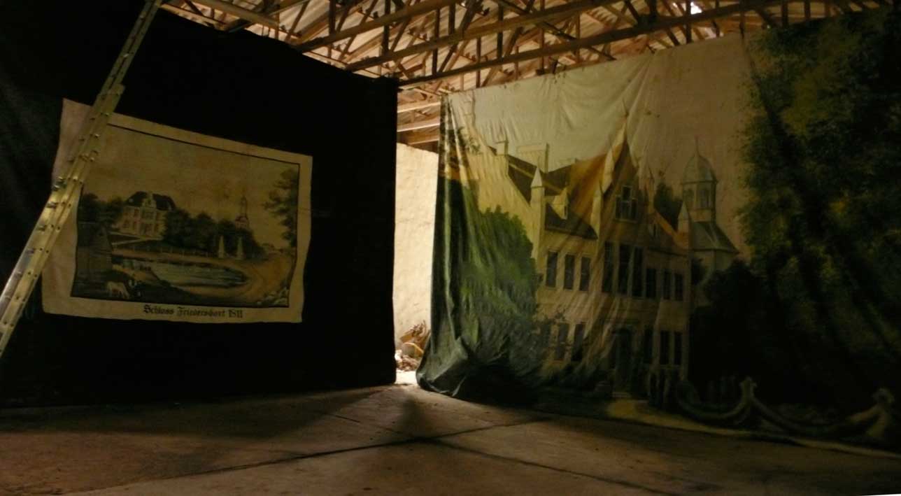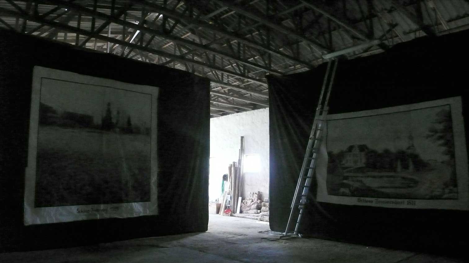 das Kleist'sche Friedersdorf in drei Versionen als gedanklicher Raum eines Kabinetts, mit dem Schloss aus Berlin als Ruine vor dem Abbruch auf der anderen Seite in eins,und darin unsere Geschichten, Auftritte am Ende der Welt