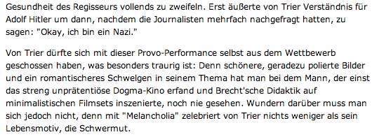 Von Triers Verbalausfall hatte begonnen, nachdem er von einem Journalisten zu früheren Äußerungen befragt wurde, in denen der Regisseur ein Interesse an Nazi-Ästhetik bekundet hatte. Im weiteren Verlauf der Pressekonferenz fügte von Trier dann hinzu: "Ich bin nicht für den Zweiten Weltkrieg, und ich bin nicht gegen Juden. Ich bin sogar sehr für die Juden. Oder nein, so doll nun auch wieder nicht. Schließlich geht einem Israel wirklich auf die Nerven." Am Ende schien er selbst nicht mehr so recht zufrieden zu sein mit dem Gesagten: "Wie komme ich jetzt bloß aus diesem Satz wieder raus." Später sagte der Däne dann noch trotzig: "Okay, ich bin ein Nazi."