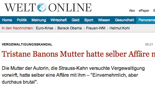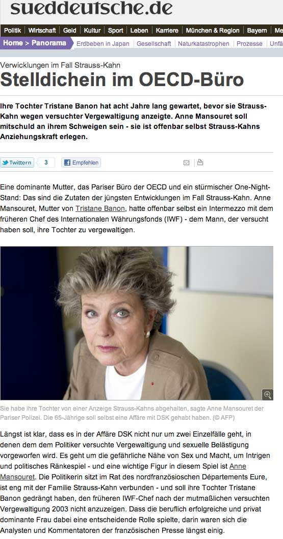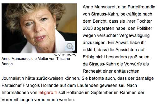 Paris (dpa) - Die Vorermittlungen gegen den frŸheren IWF-Chef Dominique Strauss-Kahn in Paris haben ein pikantes Detail zum Vorschein gebracht. Die Mutter der Frau, die ihn der versuchten Vergewaltigung wŠhrend eines Interviews beschuldigt, hatte eine AffŠre mit Strauss-Kahn. Das berichtet die franzšsischen Zeitung ÇL'ExpressÈ online. Einvernehmlich, aber durchaus brutal sei ihr VerhŠltnis gewesen, soll sie im Polizeiverhšr gesagt haben. Anne Mansouret ist eine Parteifreundin des Sozialisten Strauss-Kahn.