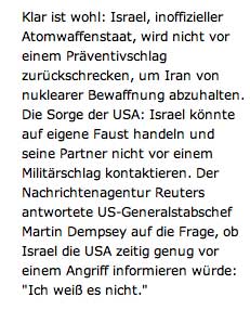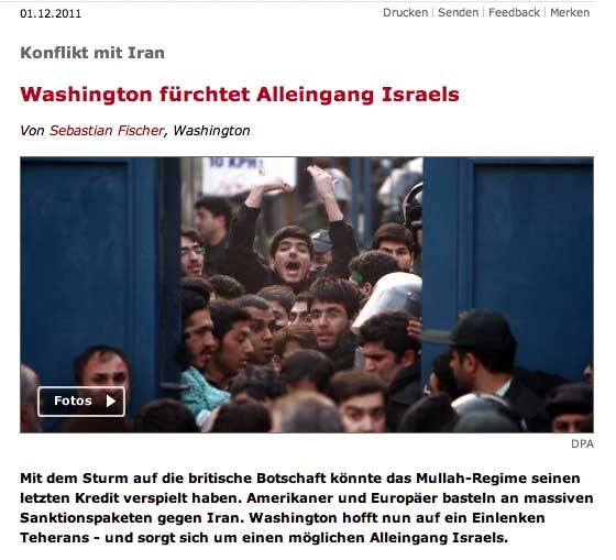 Nicht die Bombe aus Atom in Teheran war die eigentliche Bedrohung, sondern was von dort gesagt wurde, wie schon der "Irre von Lybien" Dinge sagte, die man nicht sagt und also zum Schweigen gebracht werden musste und das durch Kopfschuss, wenn das Gedränge gross war, mit einem Projektil, das man nachher nicht mehr fand. Darum war es jetzt gut, dass alle Botschafter abgezogen wurden, denn es wurde heiss, und man hatte die Sympathien der Welt auf seiner Seite, wenn man einen Angriffskrieg machte.