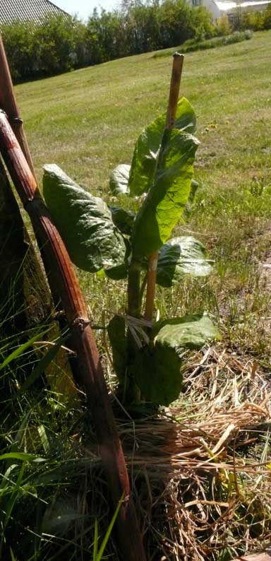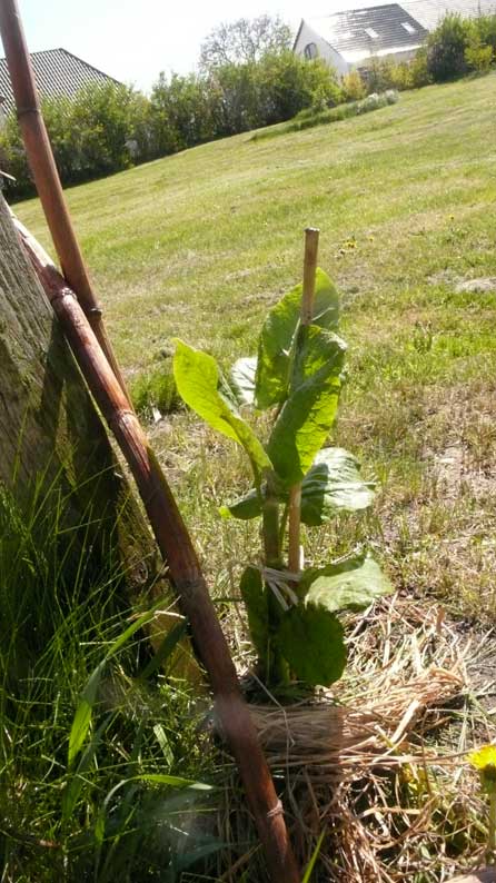 Eben noch vom Mähen beschädigt, durch Hilfsmassnahmen wohl gerettet, mit nassem Heu und stärkenden Stützen. Dieser Knöterich, sonst gerne angelehnt, soll uns frei im Raume stehen. Ein Versuch. Vielleicht kommt er durch.