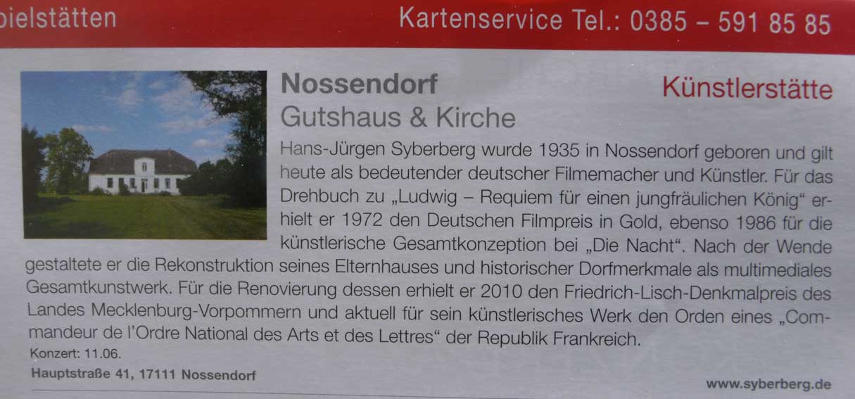 In 5 Wochen werden in Nossendorf die Gäste zu den Mecklenburg - Vorpommer'schen Festspielen kommen. Als Spielort in der Reihe Künstler-Stätten der Auftakt. Pfingsten.. Bisher gibt es keine Parkplätze im Dorf, keinen Weg von Gutshaus und Halle zur Kirche, alle Pläne und Vorschläge zur Behebung sind unbeántwortet. Das Dorf schaut wenig einladend aus, so, dass es einen Gott erbarmt. Der Bürgermeister erklärt keinen Bedarf im Namen des Gemeinderats. Kein Problem. Viel Zeit ist nicht mehr. Bäume pflanzen wohl schon zu spät.