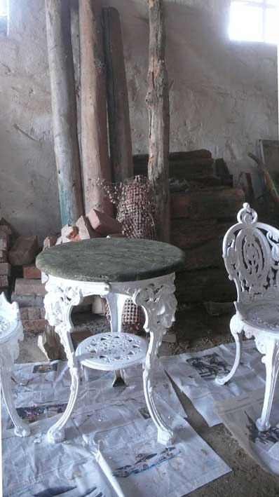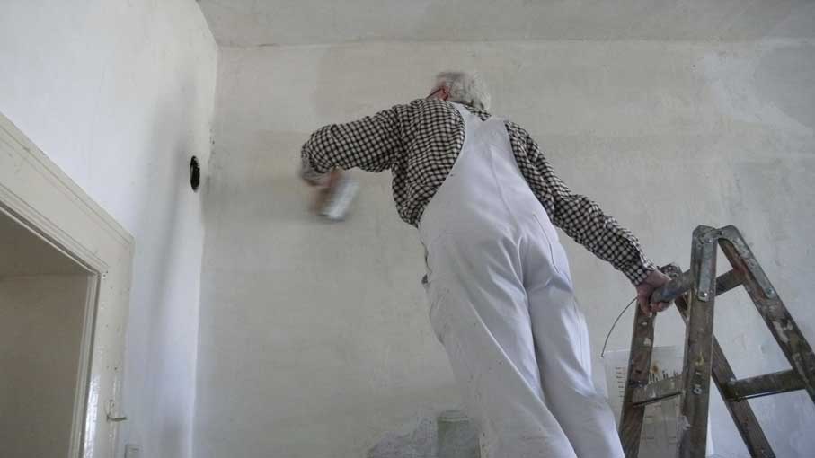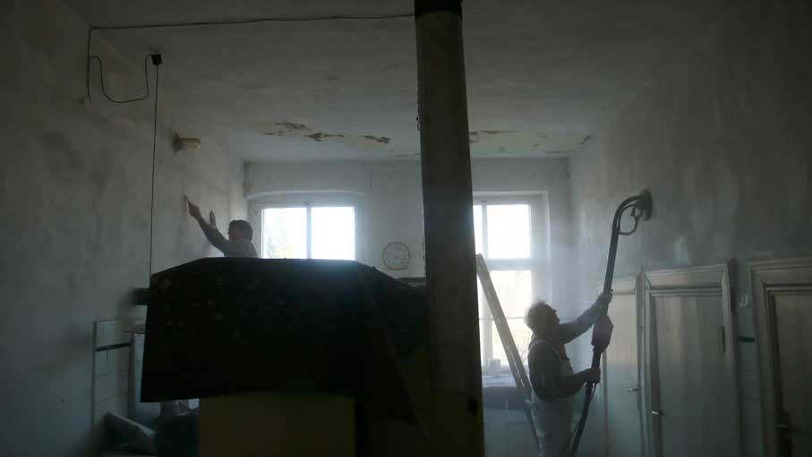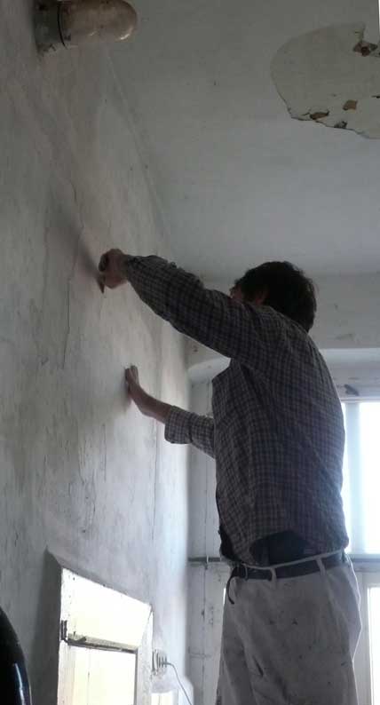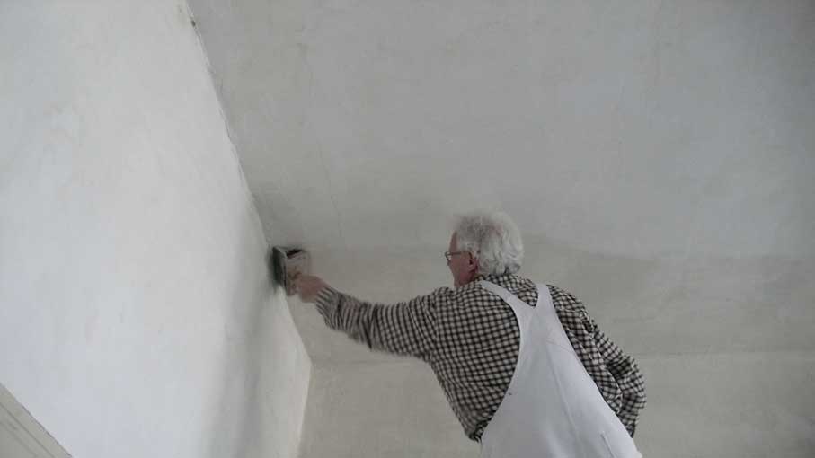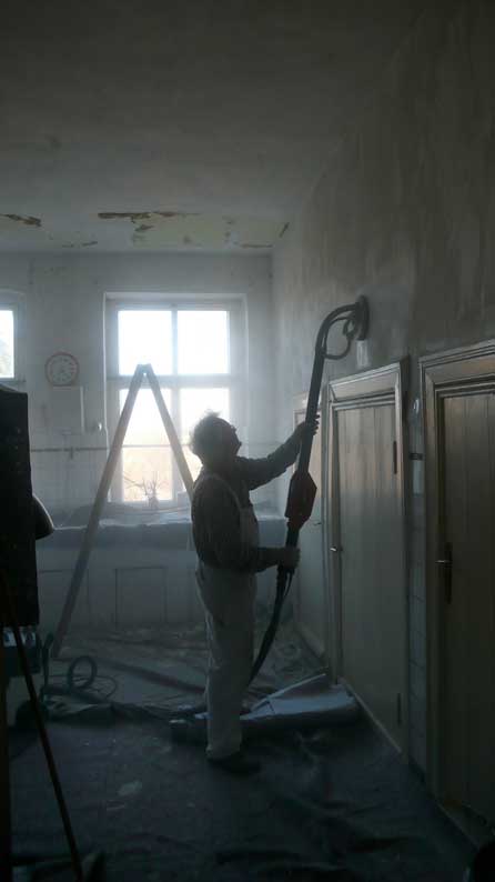 Die Küche, als erster Raum vor 7 Jahren wieder hergestellt, Von Dirk, Olav, beide tot, und Thomas, weggegangen, ist nun wieder zu streichen. Mit Sumpfkalk. Nach alter Art mit Kasein in Form von Magerquar.)