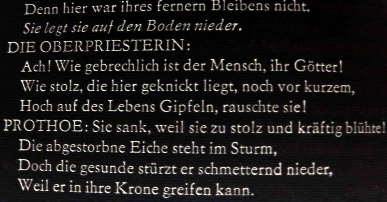 Nur einen gabs, einen, einmal, der, als er ging, allein, dass er kam, ist schon zu erwähnen, nach einer Aufführung dieser Penthesilea hinaus und überreichte den Orden des Landes, weil er imstande war es zu tun und solcherart es auch wirklich tat, beherzt seines Amtes gewiss. In ihm den Autor und das Land gleich mit zu ehren. Denn er erkannte, was hier geschah. Uns allen mit. Aller Einsamkeiten höchste Krone, der Ewigkeiten Kranz, wenn je wir zu Recht gelebt. Der Opfertod des Menschen, wenn er dazu auserwählt.