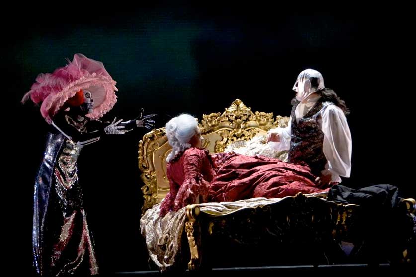 Als dann Don Giovanni zum finalen Festmahl mit dem rächenden Komtur Platz nimmt, sitzt er unter einem riesigen Knochenleuchter aus Schädeln und Gebeinen. Materialien, aus denen auch opulente Esstisch gezimmert ist. "Schädelstätte" - Golgatha? Der Herr der Eroberungen wird zwar nicht gekreuzigt, aber immerhin gerichtet, diese leichte Unschärfe lässt man der Regisseurin schon mal durchgehen. Dafür trat der Tod jetzt zusätzlich als Skelett-Kapelle auf, für alle Fälle.
