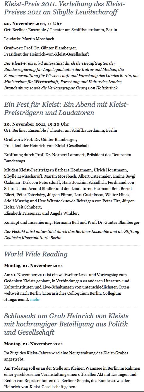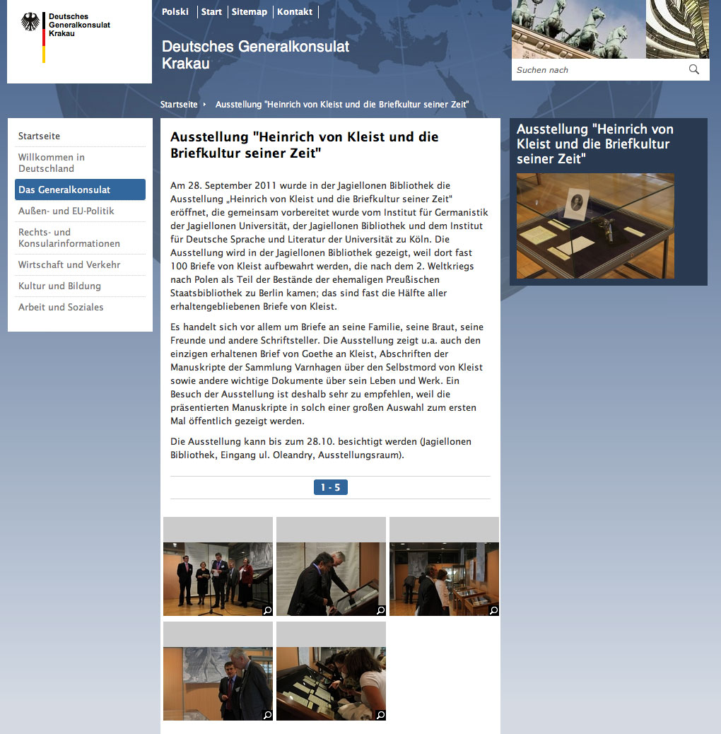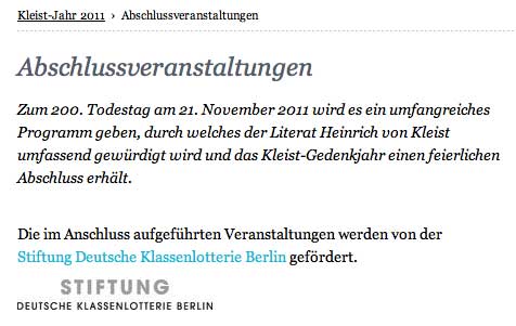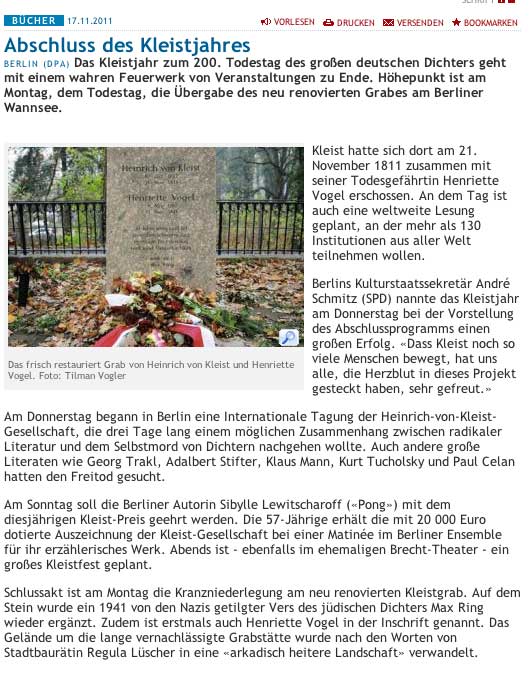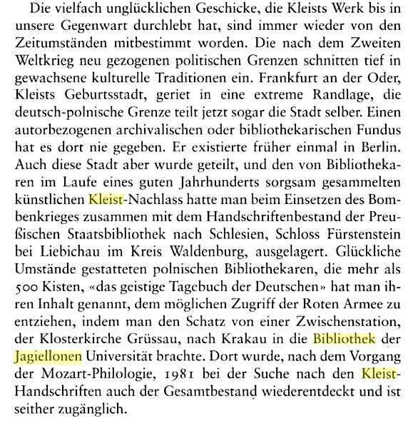 Kleist in Polen. Nach 1945 aus Schlesien nach Krakau verschleppt. Während in Deutschland man sich tummelt, Politiker Kulturfunktionäre, Medien,Künstler am Grab - wer spricht von diesem Raub? Verlust. Für die Polen ein Faustpfand eigene Dinge wiederzukrigen, und niemand hier ist es wert zu fragen, zu verhandeln. Alle Kleist- Andacht gelogen, solange das so ist. Sie wollen ihn nicht. Wer anderes sagt, lügt.
