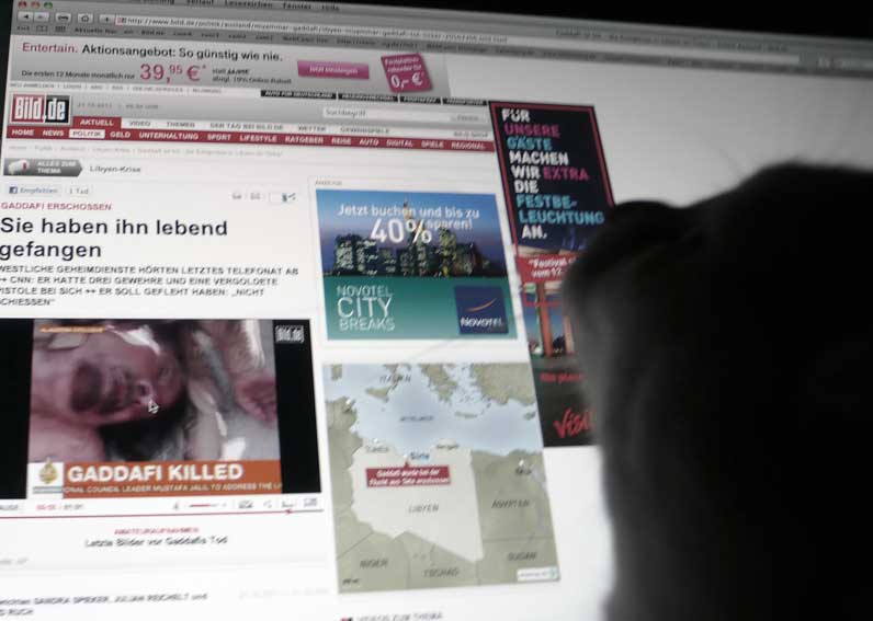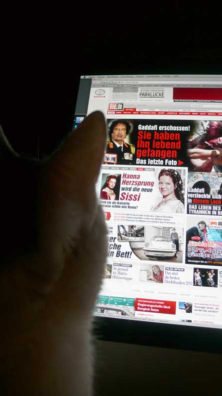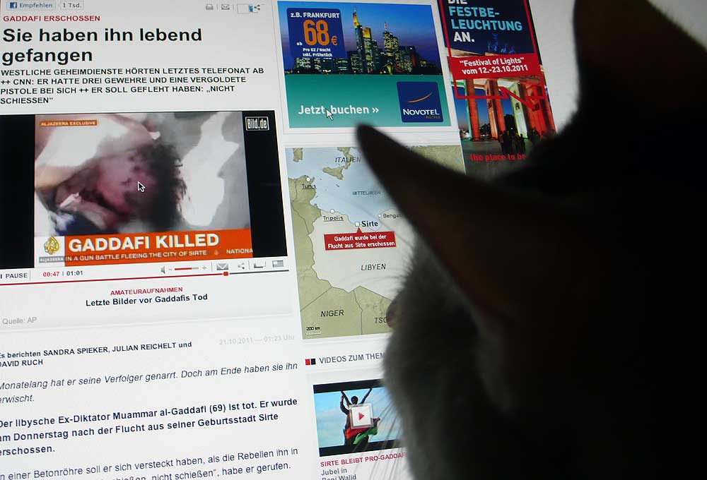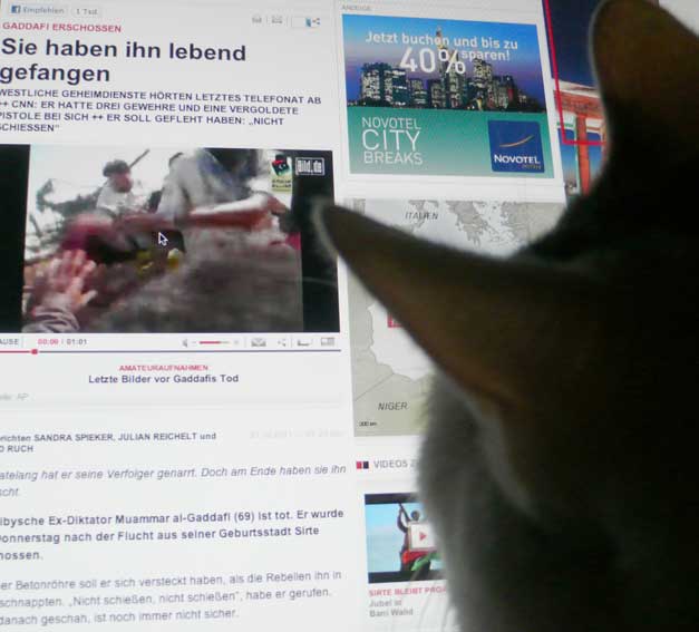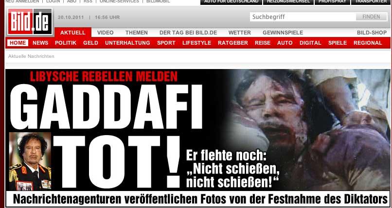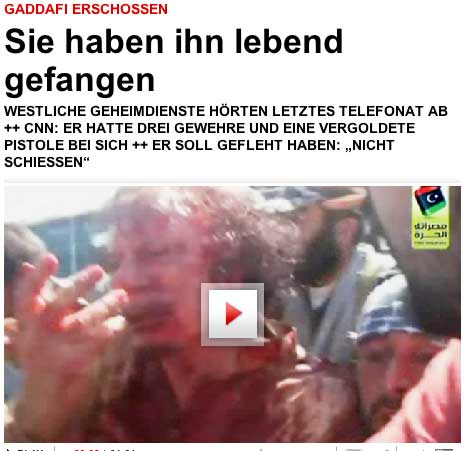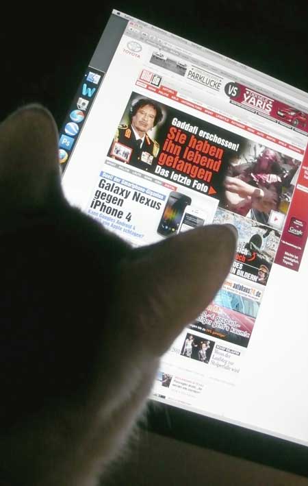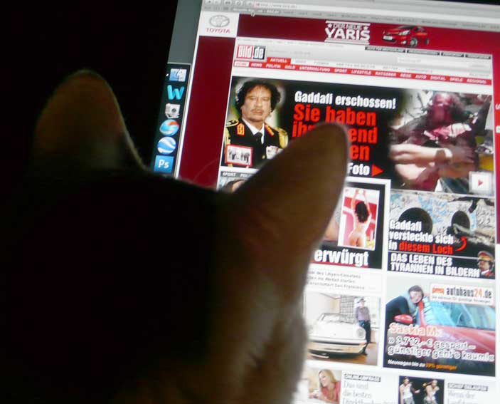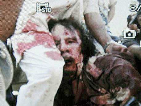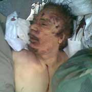 Nach einem Bericht der "New York Times" wurde Gaddafis Leichnam in Misurata von Hunderten Menschen beäugt. Feiernde Soldaten der Übergangsregierung gaben die "ultimativen Trophäen dieser Revolution" von Hand zu Hand weiter - Gaddafis goldene Pistole, sein Satellitentelefon, seinen braunen Schal und einen schwarzen Stiefel