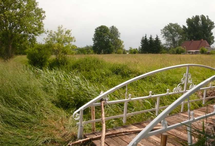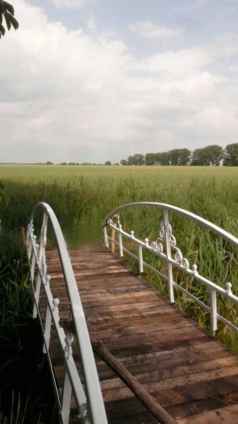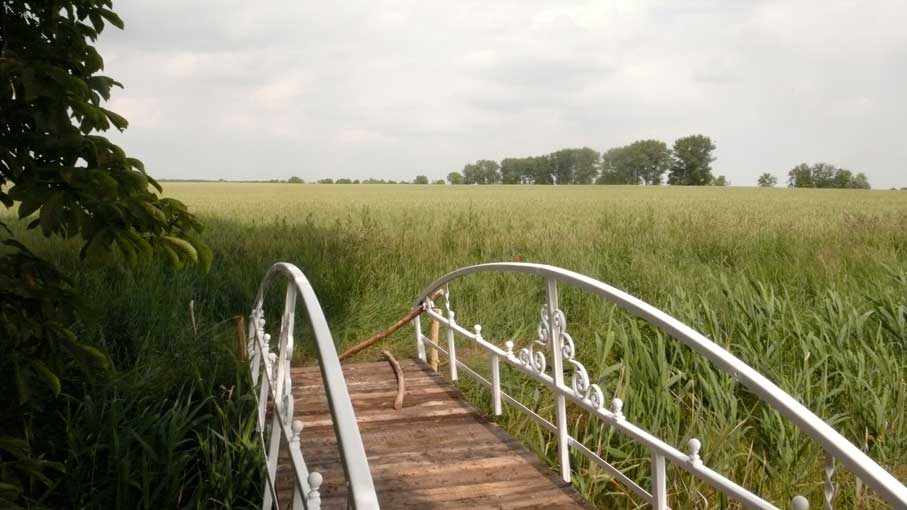 Der Übergang über den Graben wächst in die Felder auf dem Feldweg zum Wald.