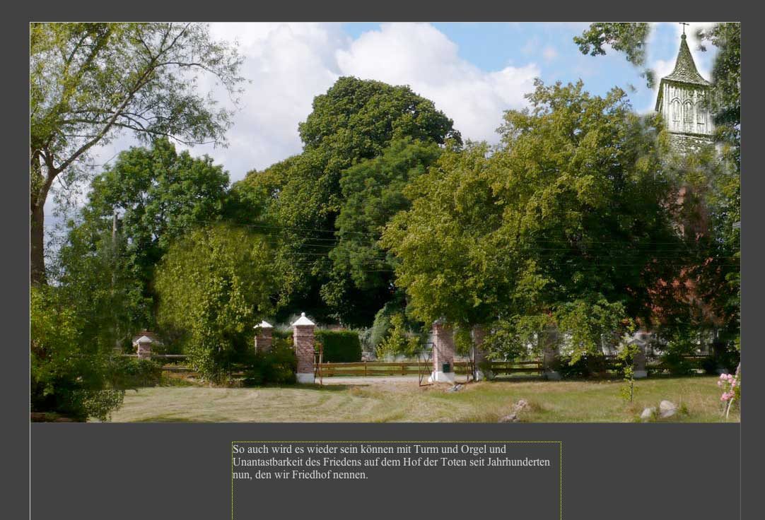 A. erzählt von seinen Meditationen auf dem Weg zur Kirche in Dargun jedesmal, wenn er dort die Orgel spielt. von der vorbereitenden Arbeit als Gang vor sich Dass ihn jemand von der Arbeit abhält, indem er ihm den Weg sperrt, mag er sich gar nicht vorstellen. Mag wohl auch damit zu tun haben, dass die Menschen nicht gelernt haben, dass es auch andere gibt und andere Arbeit. Wie hier die Arbeit der Musik. Ihre Instrumente und sie zu spielen, was denn sonst. Und dazu gehört es, sich instand zu setzen, es zu können. Und das tun wir doch täglich, jeder auf seine Weise. Wissend oder unwissend. Im Sommer werden hier in N. Leute zur Arbeit gehen und solche, die daran teilhaben, wie die das alles schon bisher besorgt haben, dass es sein kann. Momentan drumrum gehend, behindert von solchen die nicht mehr wissen wozu sie da sind. Lernen müssen, das was verlorenging. Drumherumgehen-kann er sich nicht vorstellen, in Dargun, auf dem Weg zu den Gräbern und der Kirche.