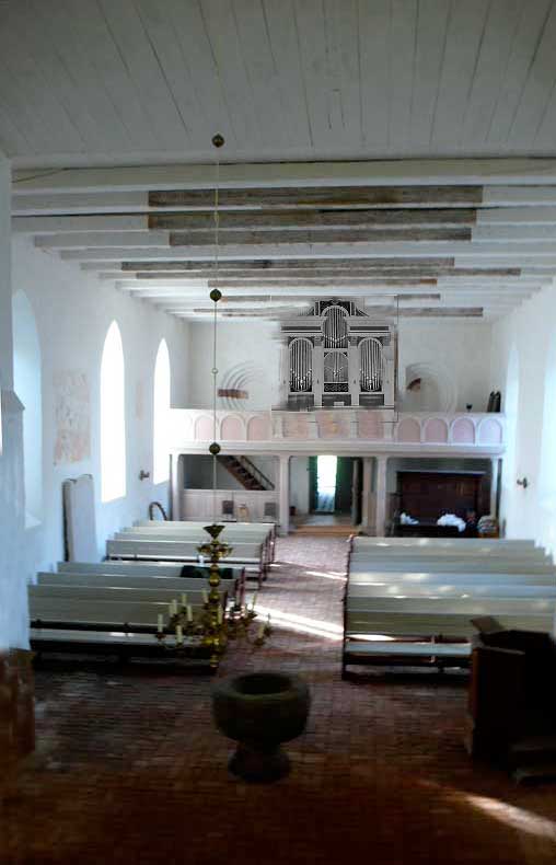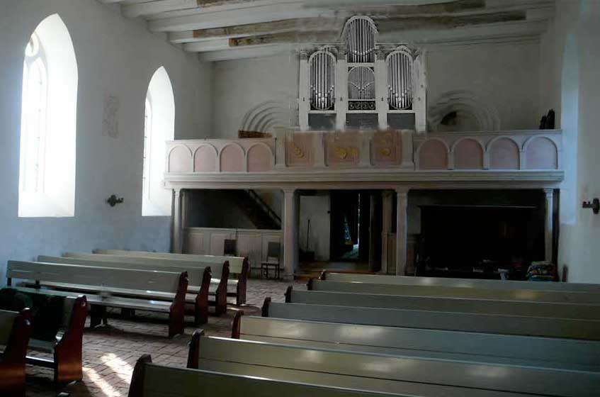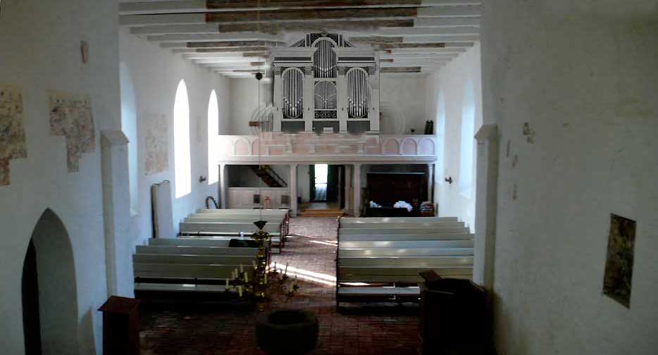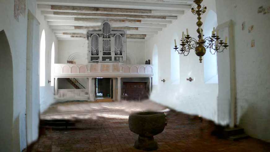 Er, der Orgelbauer, M. B. aus Friesack in Brandenburg, weiss wie das geht. Eine alte Orgel passend finden und wieder eingebaut an die alte Stelle, dem Altar gegenüber, auf die Empore, die ja noch da ist, anders als in Dargun jetzt, wo sie erst eine Empore wieder bauen müssen.