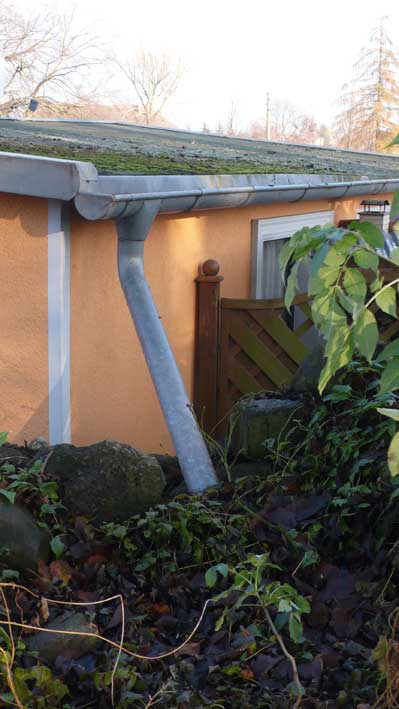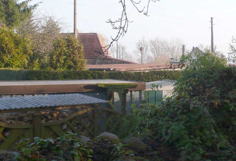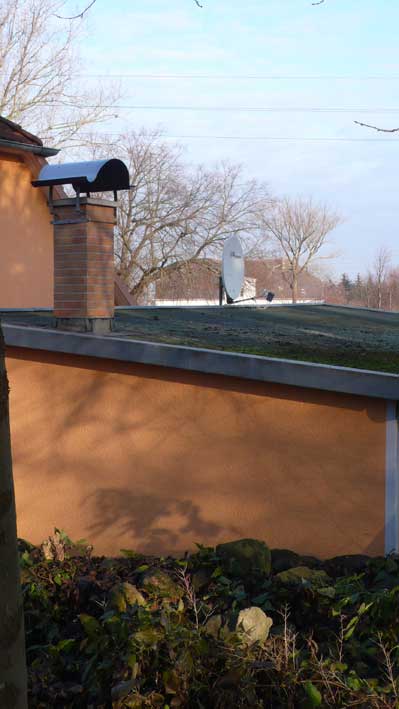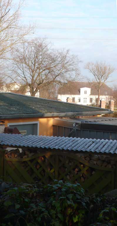 An der anderen Seite der Kirche immer noch die unterbrochene Sichtachse durch ungenehmigten Anbau unterbrochen, baurechtlich und nach dem Denkmalschutzgesetz unerlaubt, in den alten Mauern eigreifend und darüber,in jüngster Zeit noch mal erhöht. Alles im Billigmatareriel schneller Verrottung und greller Farben.