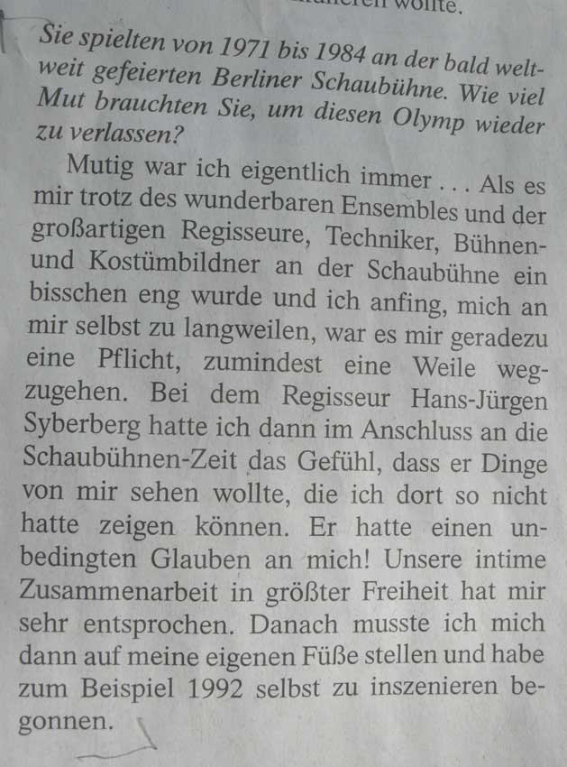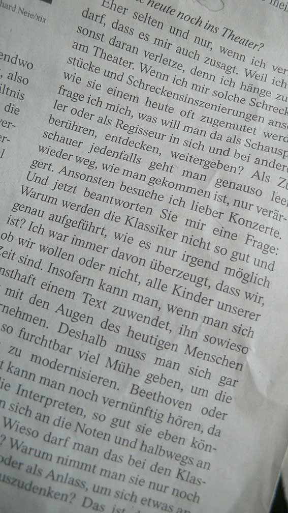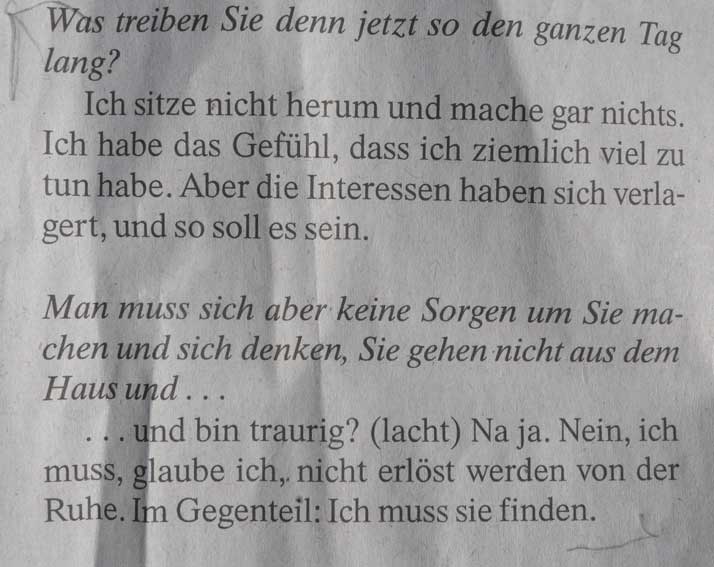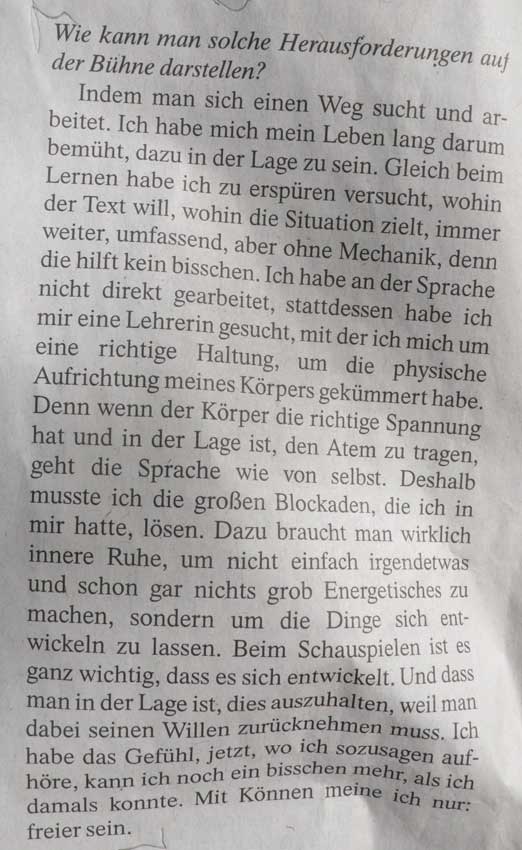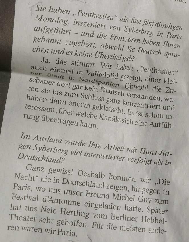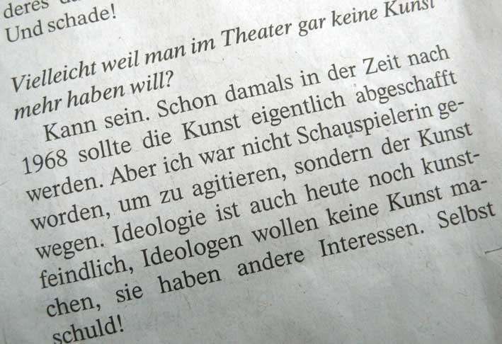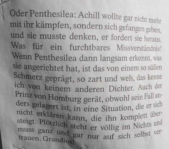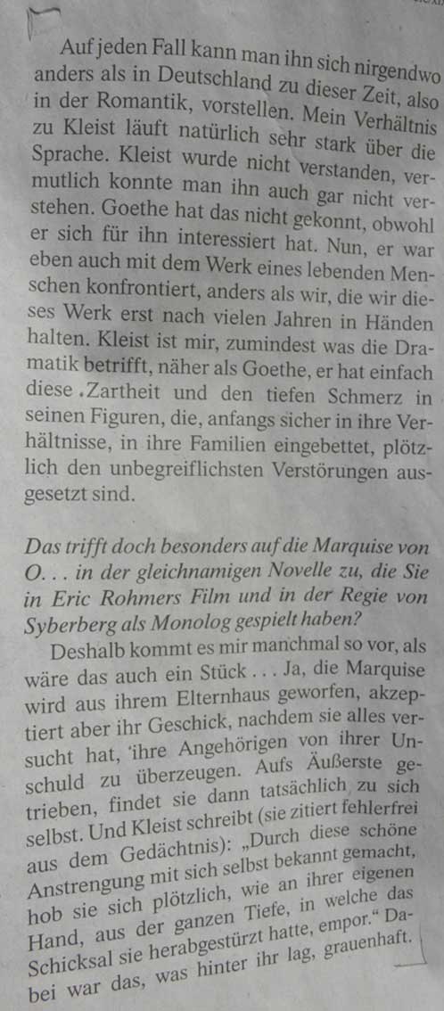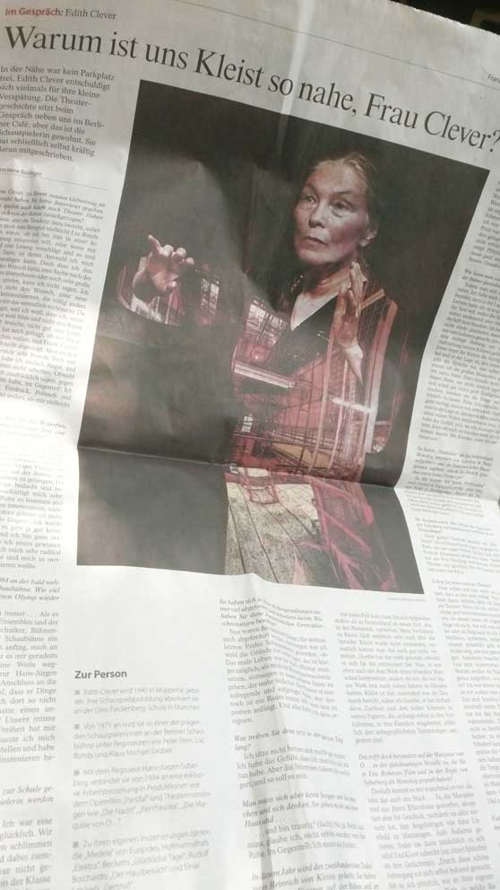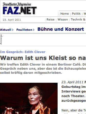 Auf der Internetseite der FAZ zu Ostern eine Seite Gespräch mit Edith Clever unter spezieller Berücksichtigung des Themas Kleist, den sie in den Monologen hier darstellte. Dafür kein Bild dazu, aber andere Bilder, die dann so aussehen: