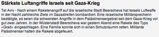 Die Aktionen Israels waren eine Vergeltung fŸr einen Angriff auf die WŸstenstadt Beerscheva. Dort war am Mittwochabend erstmals seit zwei Jahren eine Rakete des Typs Grad eingeschlagen. Sie traf einen Hof, die nebenan lebende Familie wurde jedoch nicht verletzt, weil sie nach Raketenalarm einen Schutzraum aufgesucht hatte.