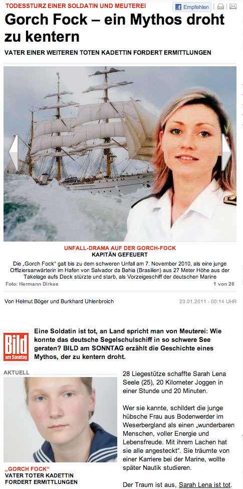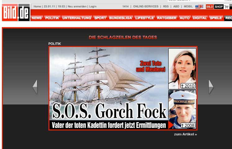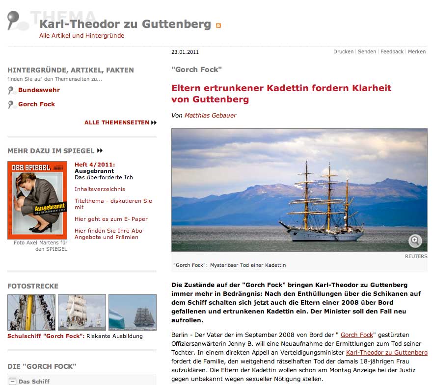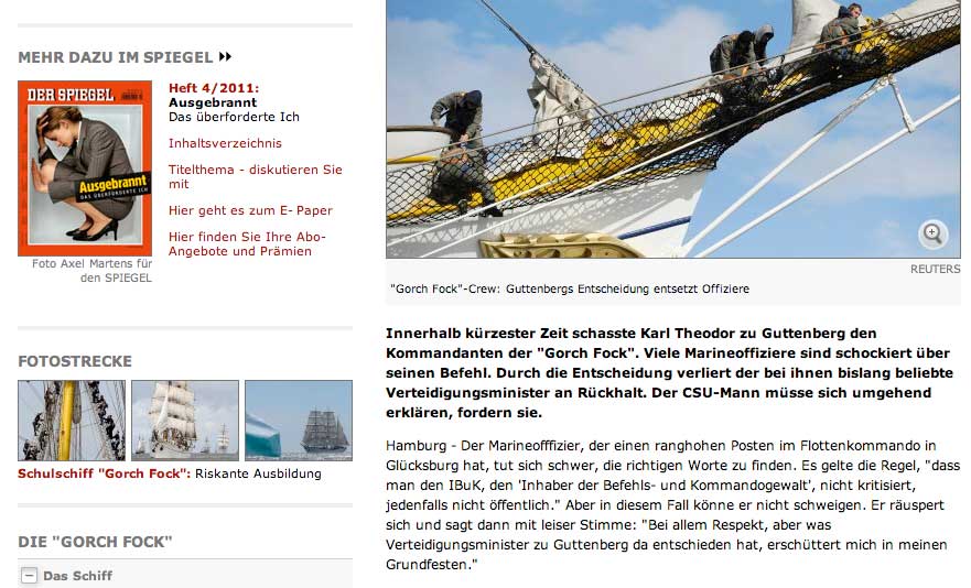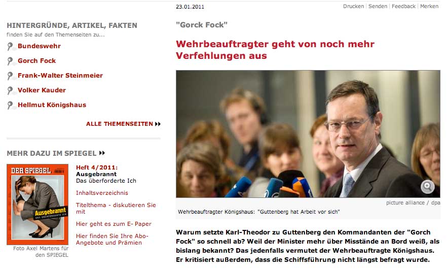 Während hier ein Drama an einem sensiblem Punkt der politischen Öffentlichkeit weltweit nach und nach sichtbar wird, sehen wir in der neuen Ausgabe des sonst streitbaren und aktuellen SPIEGEL die Nabelschau des gekrümmten Ich im Büro-Kostum und auf hohen Absätzen und die neuesten Meldungen On-line - immer einige Stunden nach der BILD-Zeitung hinterher. Dort vorher nackt und nahe dran, macht sie Politik oft vor den poltischen Akteuren und treibt diese vor sich her.