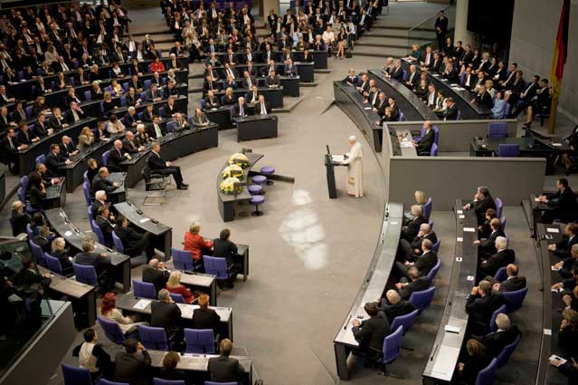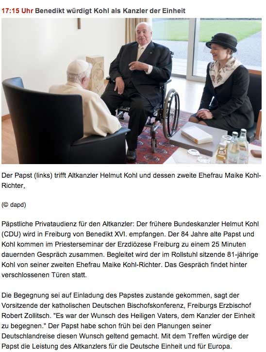 Schade nur, dass seine Reise auch zu einem Unwürdigen führte, der dies Recht verlor, indem er diesen Einklang missen muss, als er im Anspruch seines Amtes des Einheitsbringer gerade die Gerchtigkeit aufgab, als Mass aller Dinge unter den Menschen zu gunsten irdischer Vorteilen wie er dachte, wie sein hoher Gast warnte, wenn Gott von Frieden spricht, unter den Menschen in der Geschichte des Landes und unserer Natur vor Gott. Ohne Recht wäre der Staat nichts als eine Räubererbande, so der Papst im Bundestag nach Augustinus und genau als das erwies sich dieser nach dem Kohl'schen Fall der Mauer bis heute, mit allen Folgen überall nach dieser demokratischen Devise: es gilt, was mir nützt.