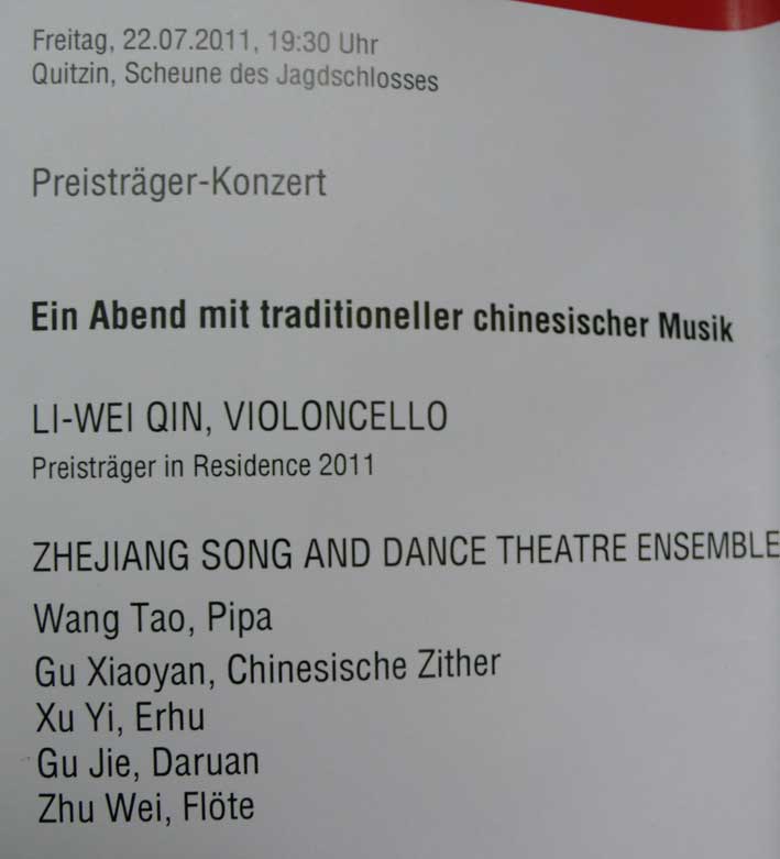 Quitzin (OZ) - Nichts ist unmöglich! Nicht einmal höchst exotische Klänge aus Fernost in der Scheune des vorpommerschen Jagdschlosses Quitzin. Dort präsentierten nämlich die Festspiele Mecklenburg-Vorpommern am Freitag traditionelle Musik aus China. Dies natürlich mit chinesischen Künstlern und dem notwendigen traditionellen Instrumentarium. Musik also, irgendwie aus den Medien bekannt, nicht aber wirklich vertraut und deshalb als selten gebotenes Live-Erlebnis von besonderer Wirkung. Sie wirkt auf Grund ihres gänzlich anderen Tonsystems (Pentatonik — Fünftonskala), ausgeprägter melodischer Kurzgliedrigkeit und nur sparsamer Harmonik für unsere Ohren zunächst befremdlich, verrät aber bei genauem und längerem Zuhören viel von ihrer kompositorischen Kunstfertigkeit und Ausdruckskraft. Dass sich das mit unseren eigenen Hörerfahrungen nicht deckt, kann dabei nur den Anreiz vergrößern, sich dieser Klangwelt möglichst vorbehaltlos zu öffnen. Dann nämlich geht es im Großen wie im Detail um spannende Entdeckungen. Das betrifft ein überaus reizvolles Instrumentarium mit sehr spezifisch gehandhabten Blas-, Streich- und Zupfinstrumenten, es betrifft eine Klangwelt von sehr eigener Ausprägung und es bezieht sich nicht zuletzt auf die Möglichkeiten, in der erklingenden Musik etwas von der Mentalität und der nicht weniger als jahrtausendalten Ausdruckskraft fernöstlichen musikalischen Denkens aufzuspüren. Das ist nicht einfach, aber es lohnt. Und genau darin dürfte der eigentliche Wert solcher Veranstaltungen liegen. Und es braucht dazu keine Massen. In Quitzin genügten Meistercellist und Moderator Li-Wei Qin sowie jene fünf Mitglieder des in China hochdekorierten Zhejiang Song and Dance Theatre Ensemble, die sich mit Flöten, den lautenähnlichen Pipa und Daruan sowie auf Erhu (zweisaitige Kniegeige) und Chinesischer Zither als hochvirtuose, künstlerisch überzeugende Musiker erwiesen. Ein überaus sympathischer Abend mit bleibenden musikalischen Eindrücken und viel Erkenntnisgewinn!