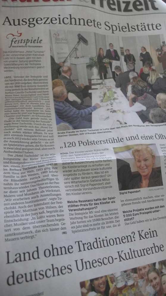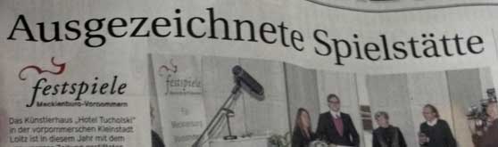 Der diesjährige Preis der Festspiele Mecklenburg Vorpommern ging an Loitz als Spielstätte(Hotel Tucholski)