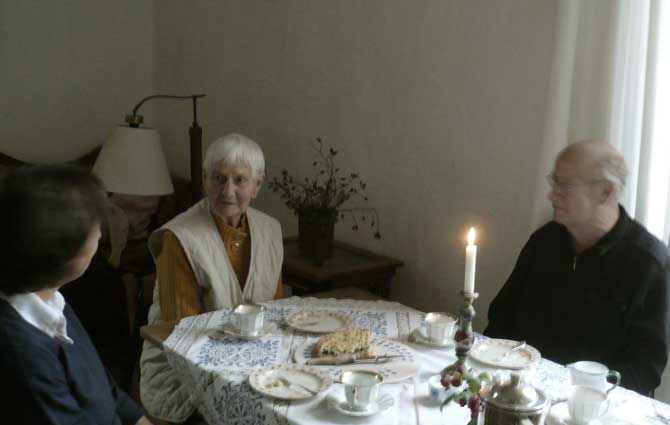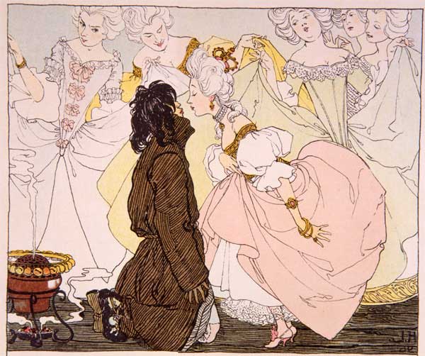 "Was ist das doch für eine langweilige Geschichte", sagte die Prinzessin. "Nun gut, es sei! Aber ihr müsst vor mir stehen, damit es niemand sehen kann!" Die Hofdamen stellten sich davor und breiteten ihre Kleider aus. Da bekam der Schweinehirt seine zehn Küsse, und sie erhielt den Topf.