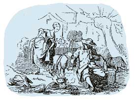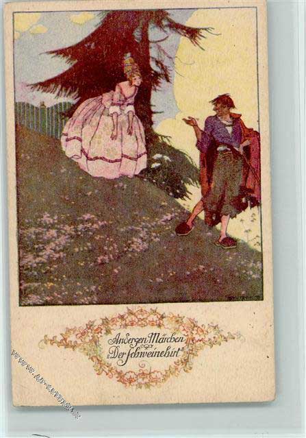 Da musste eine Hofdame wohl oder übel zum Schweinehirten gehen, aber sie zog Holzpantoffeln an. "Was willst du für den Topf haben?", fragte die Hofdame. "Zehn Küsse von der Prinzessin", antwortete der Schweinehirt. "Gott bewahre uns", rief die Hofdame. "Ja, anders tue ich es aber nicht" erwiderte der Schweinehirt.