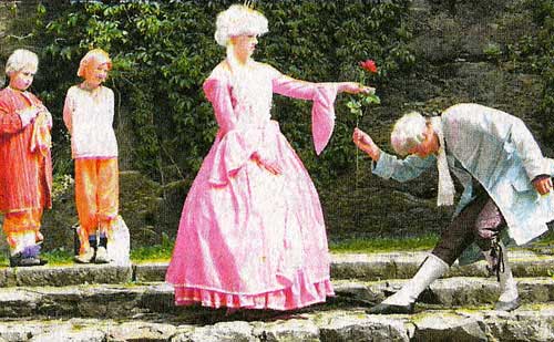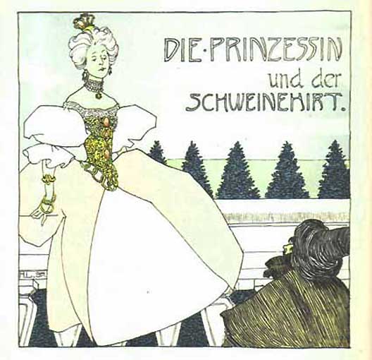 Nun kam die Prinzessin mit allen ihren Hofdamen daherspaziert. Und als sie die Melodie des Topfes hörte, blieb sie ganz erfreut stehen, denn sie konnte auch "Ach, du lieber Augustin" spielen. Das war das Einzige, was sie konnte, und sie spielte es mit einem Finger. "Oh", rief sie, "Das ist ja das, was ich kann! Das muss ja ein gebildeter Schweinehirt sein! Geht hinunter und fragt ihn, was das Instrument kostet!"