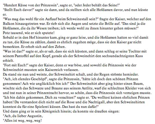"Hundert Küsse von der Prinzessin", sagte er, "oder jeder behält das Seine!" "Stellt euch davor, wenn ich ihn küsse" sagte die Prinzessin, und alle Hofdamen taten wie befohlen. "Was mag das wohl für ein Auflauf beim Schweinestall sein?", fragte der Kaiser, der auf den Balkon hinausgetreten war. Er rieb sich die Augen und setzte die Brille auf. "Das sind ja die Hofdamen, die dort ihr Unwesen treiben. Ich werde wohl zu ihnen hinuntergehen müssen!" Potztausend, wie er sich sputete!