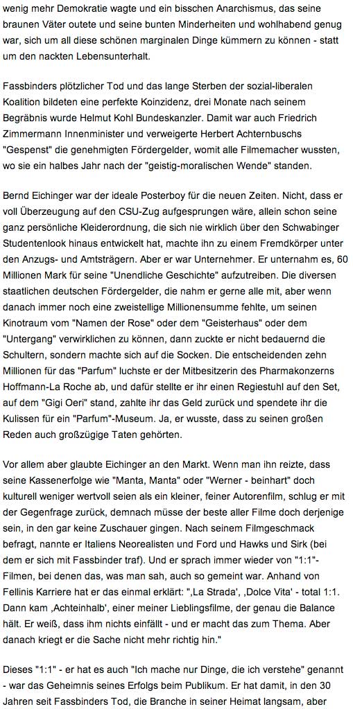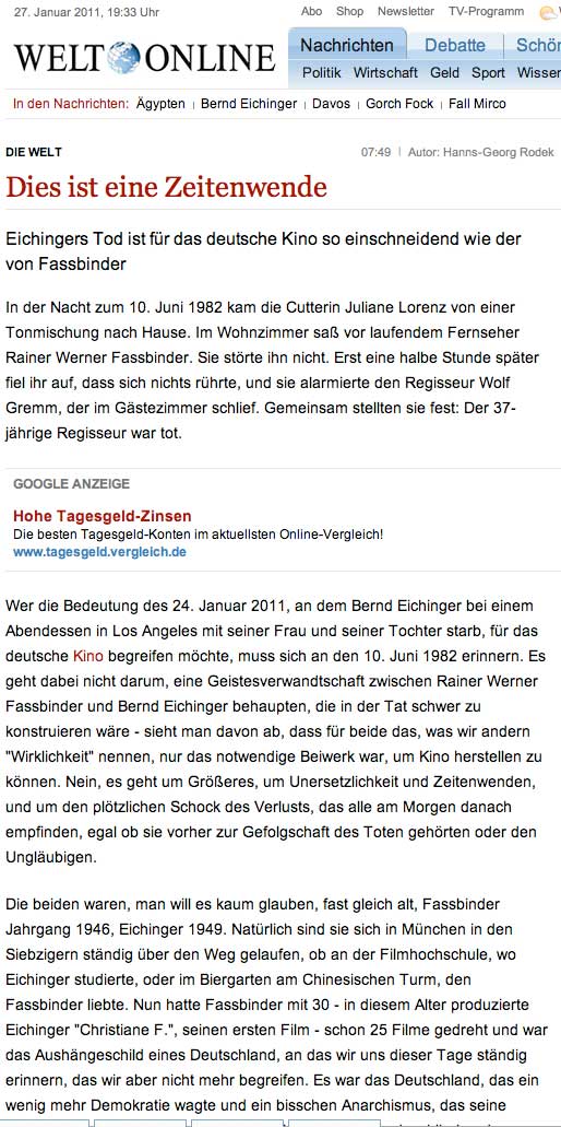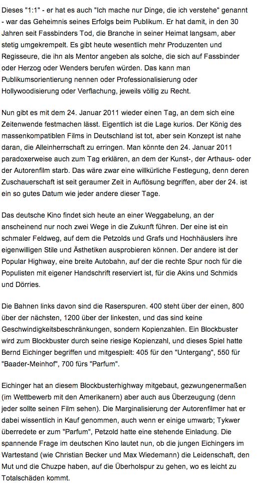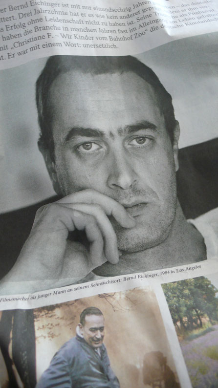 Er, der soviel Gelder verwaltete, einnahm und ausgab, riskierte und gewann, der Meister der Öffentlichkeit im Vergleich zum damals schmalem Budget und vergleichsweise übersichtlichen Partnern in der Produktion, als wir zusammen arbeiteten. Er sprach immer wieder, am Abend im letzten Dezember, von den Husarenritten bei der BBC anlässlich des Hitler-Films und so immer alles oder nichts, wenn er dabei war, und kannte meine Film-Leidenschaft, für die er heute in seinen Produktionen gerühmt wird, aber auch alle anderen haben schwere Verhandlungen gemeistert und um ihm kennt er das Wort vom Leben gleich Film. Wollte ihn fragen, einmal später in Ruhe, die wir uns vornahmen, auch hier. Nun muss ich versuchen zu denken, was er meinte.