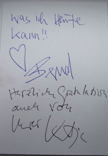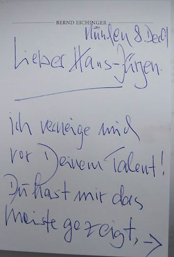 Und wenn ich versuche zu denken, was es wohl ist, was trotz aller andere Bewunderungen für grosse Namen im Film ihn wohl zu diesem hier Bekenntnis bewogen, als ob es ein letztes Wort sei, sorgsam gesetzt : "Talent," nicht mehr, was man so leicht nicht sagt, "das Meiste", nicht alles, wie kann es das auch, dachte er genau und "Heute"(!) gross mit dem "kann", nicht was ich Heute bin, mit zwei Ausrufezeichen, voll bewusst was und wer das spricht und mit jenem gezeichneten Herzen, anstelle der Worte und das "Bernd" wie wir uns nie nannten, immer per Sie. Was darf ich wohl denken.